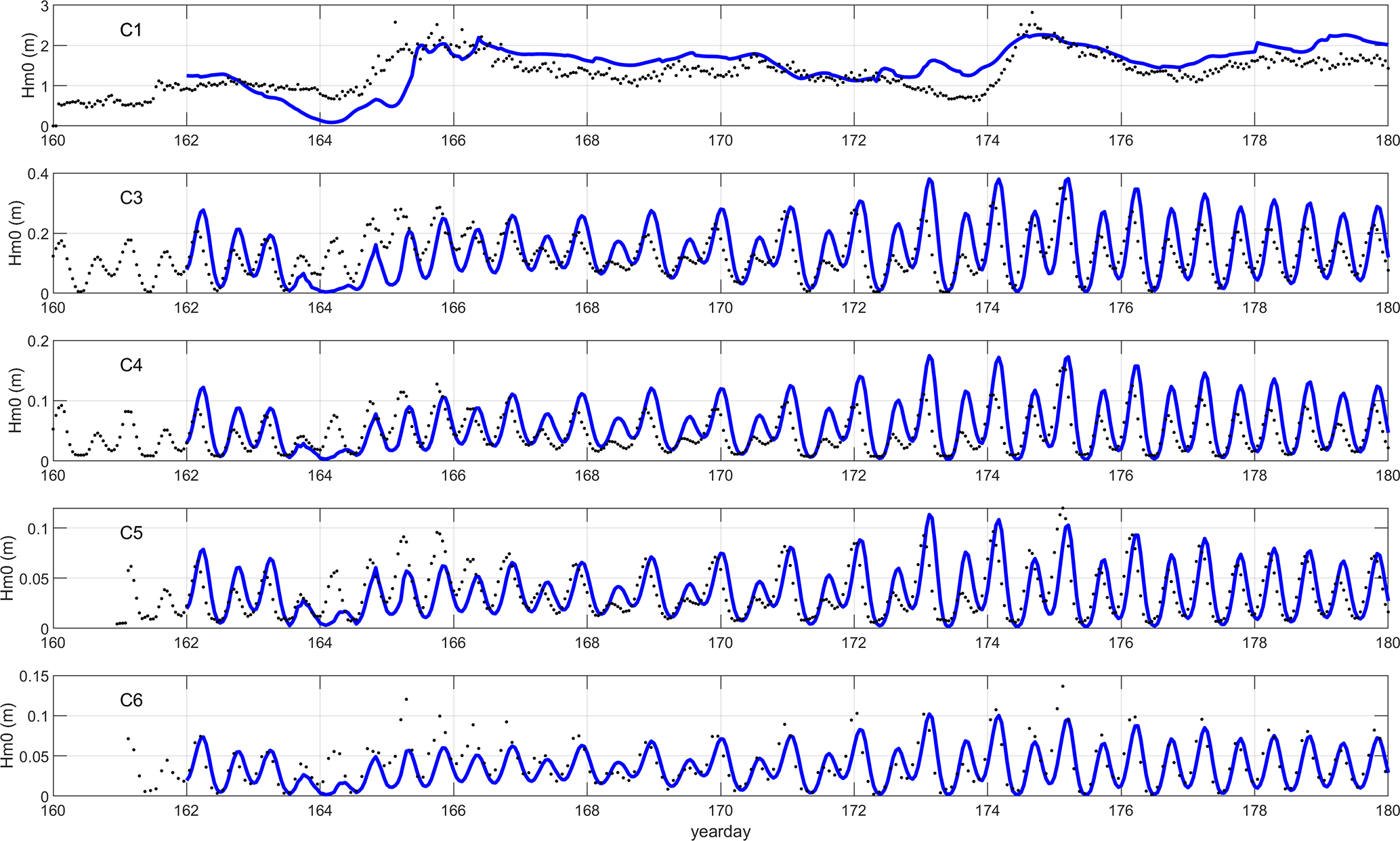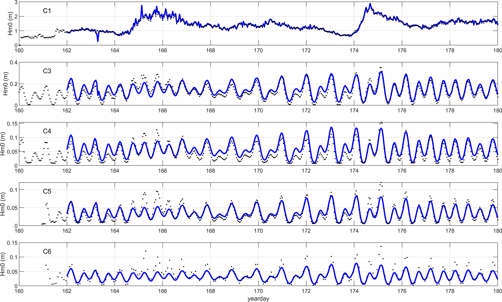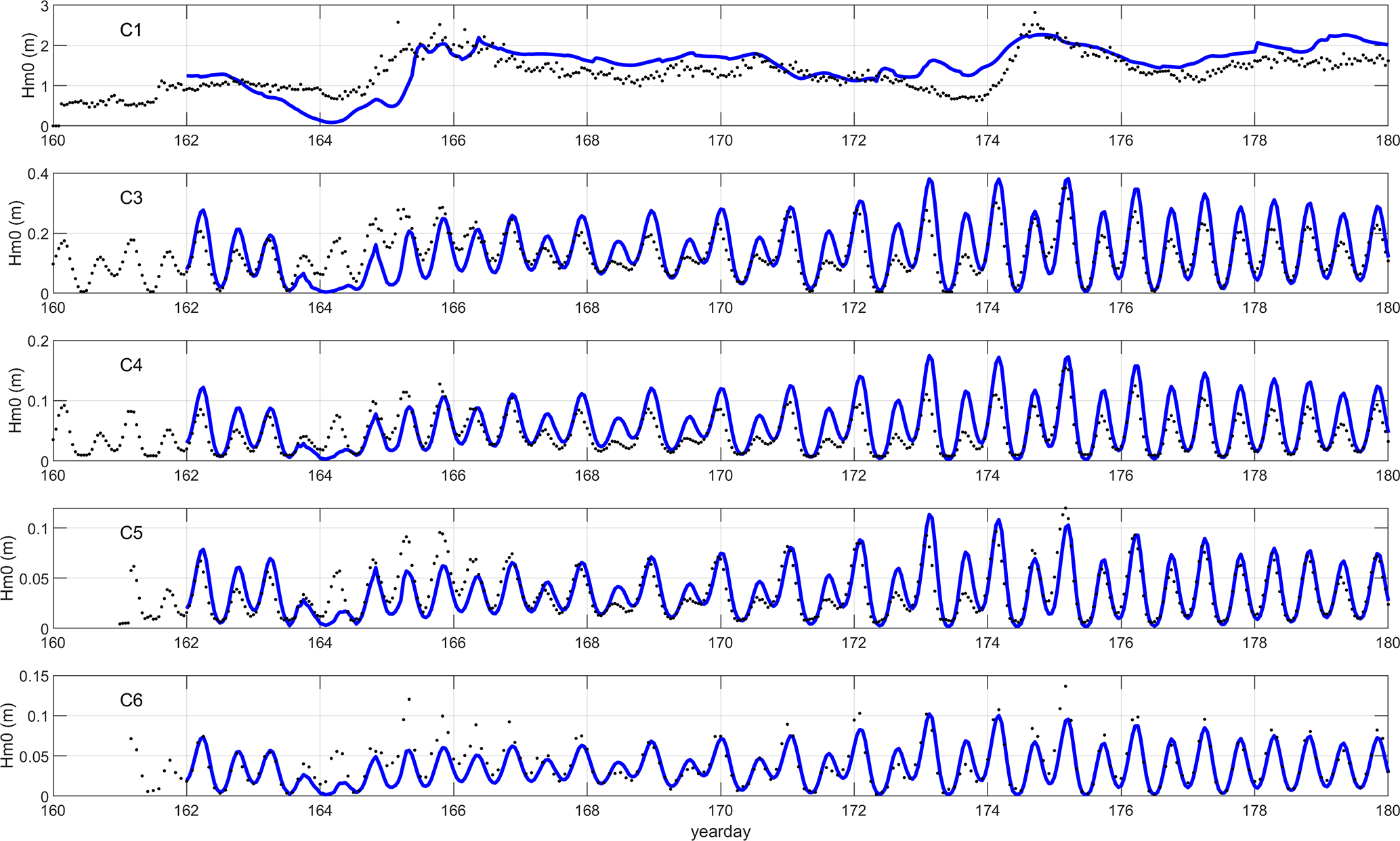 Figure 29Time series of Hm0 wave height across the reef at Ningaloo; observations (black dots) against model simulation (blue drawn lines). Large-scale model, simulation results shifted by one hour.