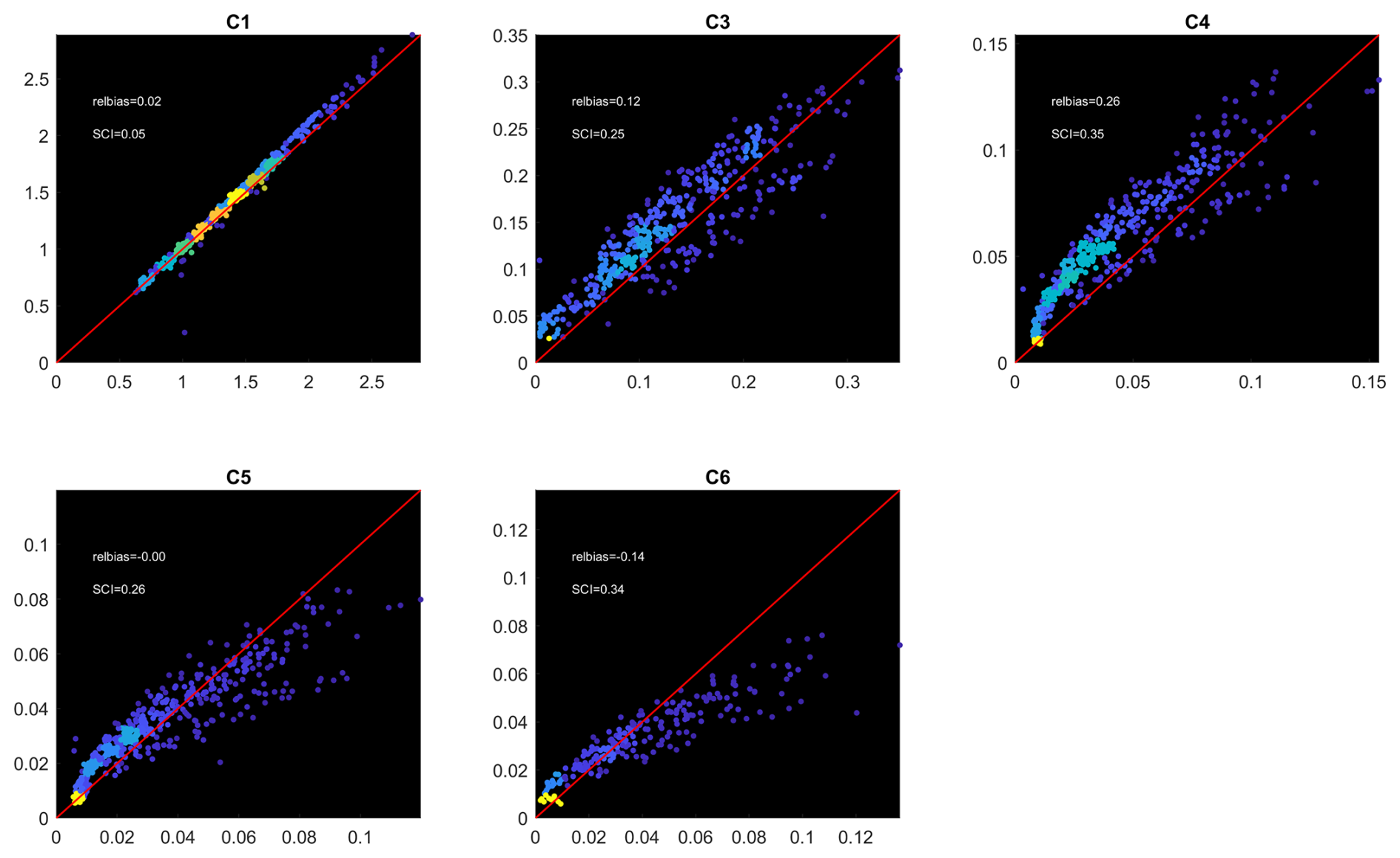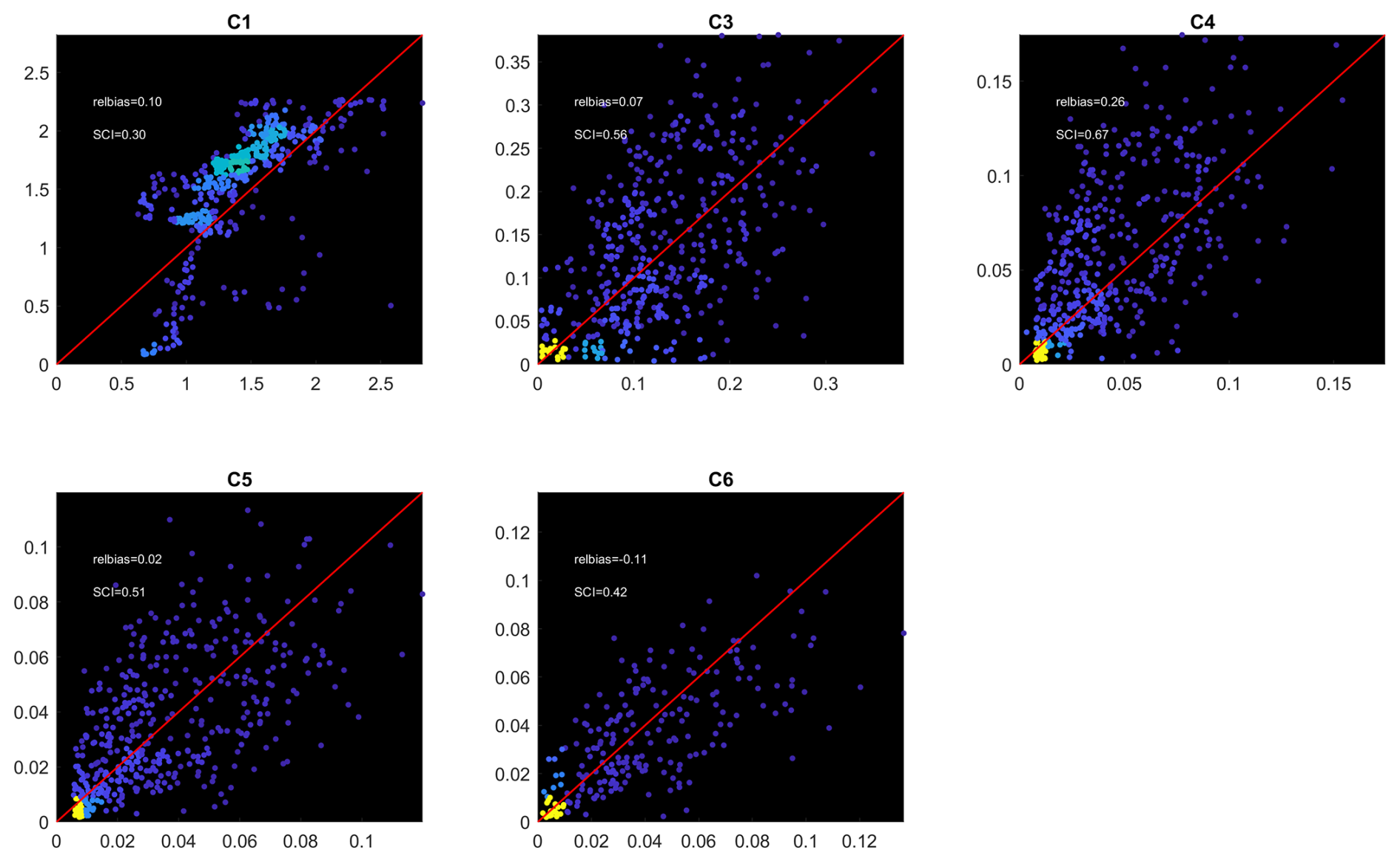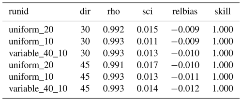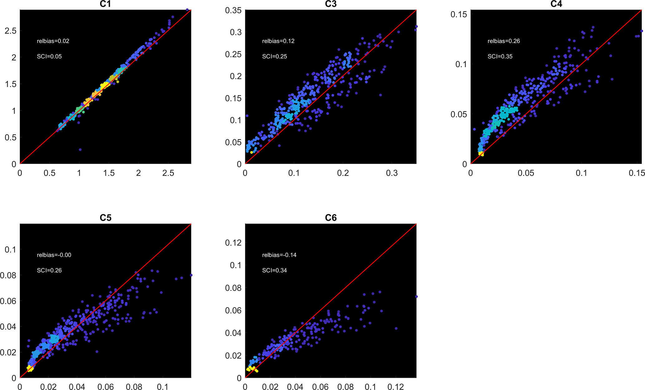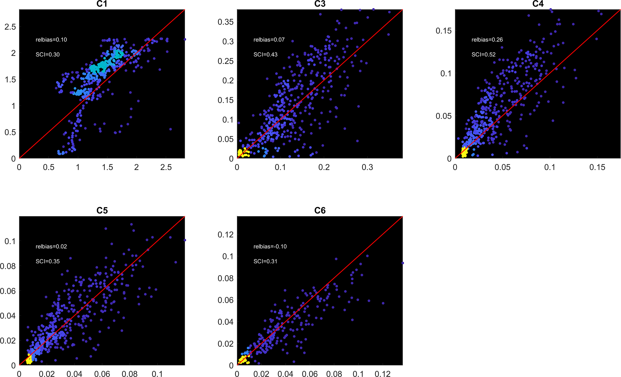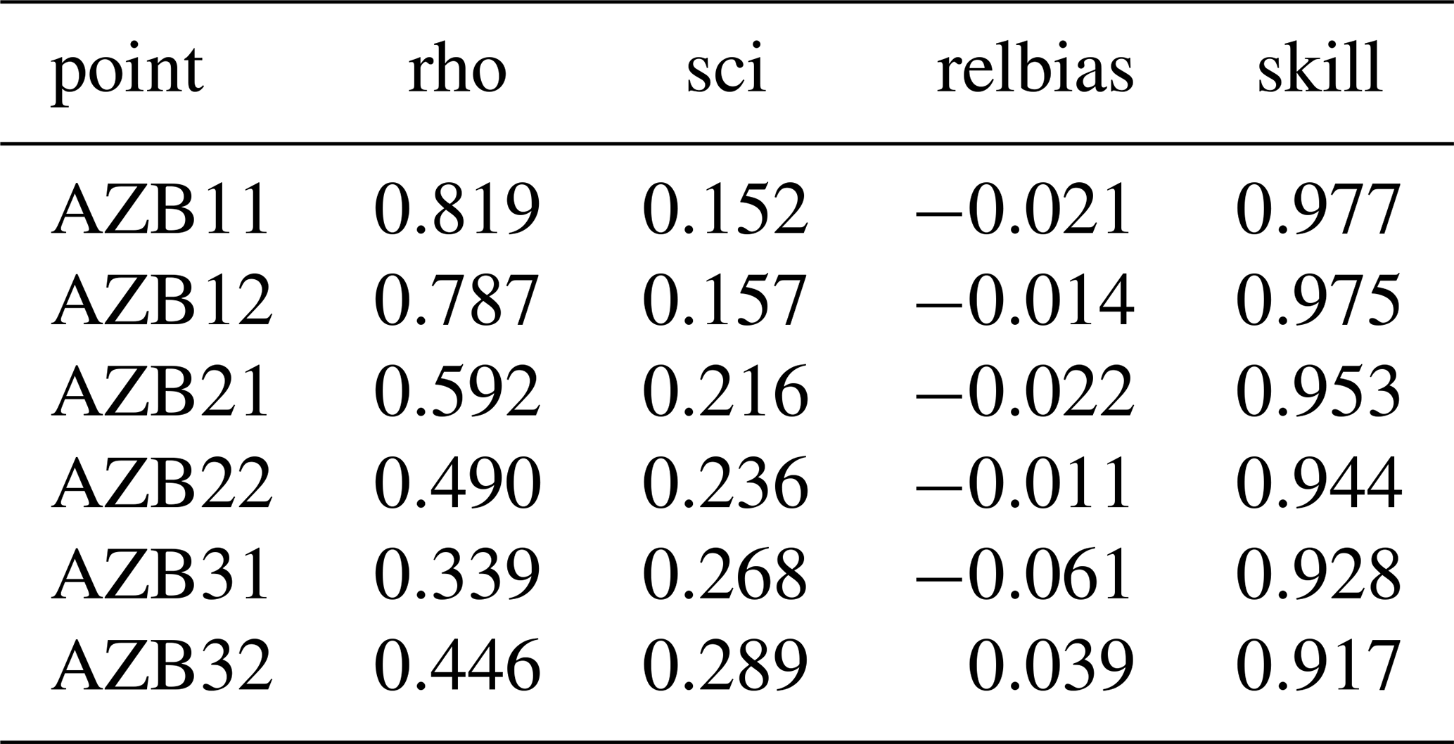 In comparison of model to theory or data, the error metrics Pearson's correlation coefficient (rho), scatter index (sci), relative bias (relbias), and Brier skill score (skill) are computed as shown in Table A1.