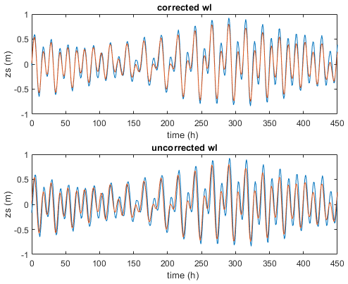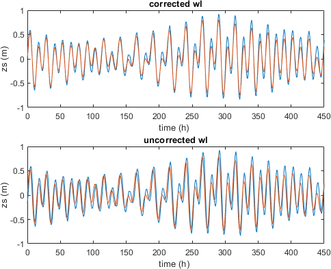 Figure 28GTSM hindcast of water level (blue) vs. observed (red). Lower panel: uncorrected except for 8 h shift from GMT to local time; top panel: GTSM model shifted by one hour to GMT + 7 h.