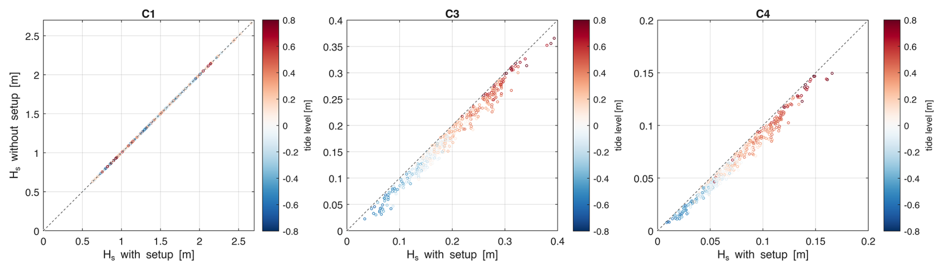 For a given water level, the local wave setup can have an important influence on the wave decay. In such cases, a coupled hydrodynamic model is needed to provide this non-uniform water level. We tested the effect of wave setup by using Delft3D-FM with the in-built SnapWave solver to check how important this effect is. The model was set up for the local grid and fed with constant water level boundary conditions, over the same period as for the other simulations. In Fig. 31 the wave heights for the simulation without wave setup are compared with those including the effect of wave setup. The effect is significant, in the order of 2–3 cm or about 10 %–20 % of the local wave height. Still, in light of the uncertainty in the local water level, this is still a relatively minor effect.