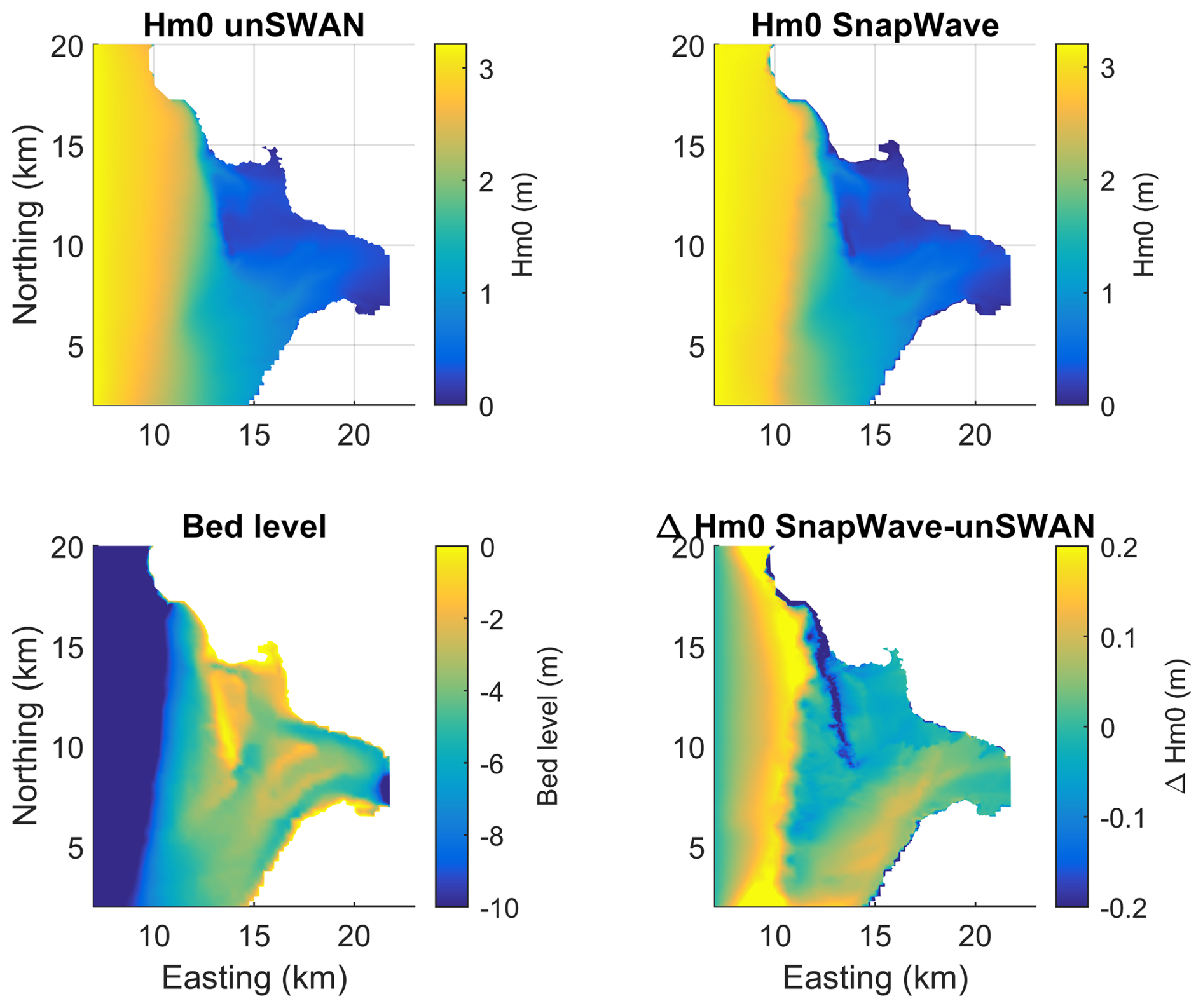 Figure 32Comparison of unSWAN and SnapWave for the Haringvliet case. Top left and top right panels: Hm0 computed by unSWAN resp. SnapWave; lower left panel: bed level; lower right panel: difference between the models.