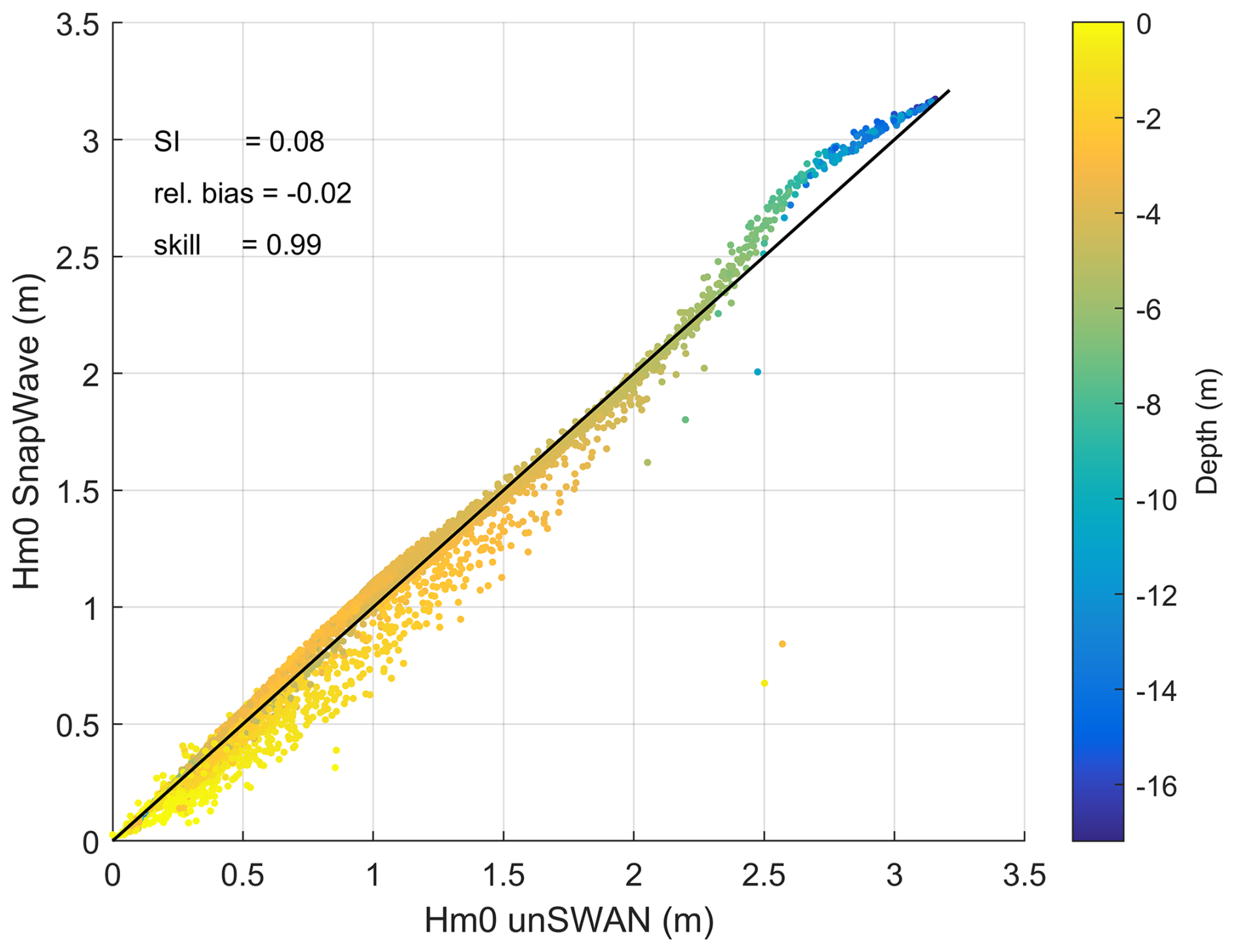 We may conclude that in this kind of nearshore application dominated by refraction, shoaling, bed friction and wave breaking dissipation, differences between SnapWave and unSWAN are small in the light of other uncertainties, and that SnapWave is two orders of magnitude faster.