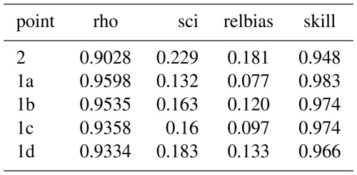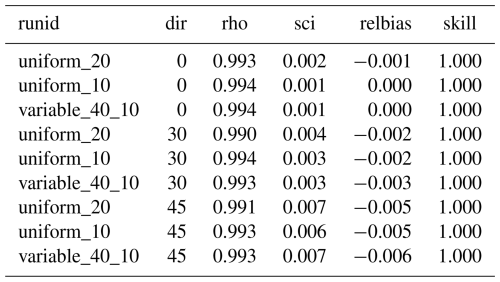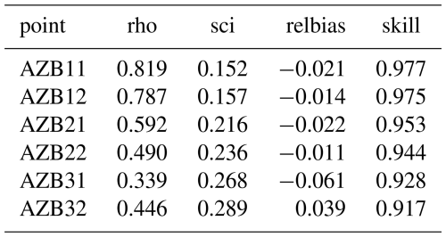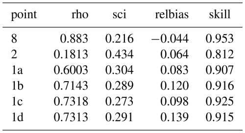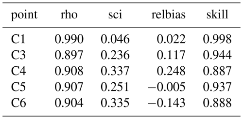 The scatterplots shown in Fig. 13 confirm this narrative, as do the error metrics in Tables A5 and A6. Point 8 is mostly indicative of the skill of the ERA5 hindcast and has a low bias of 7 % and a scatter index of 22 %. In point 2 the scatter index is quite high since the short time series includes the event that was missed by ERA5. The points through the surf zone have a bias of around 10 % and higher scatter indices than the local model, mostly for missing the event on 3 November.