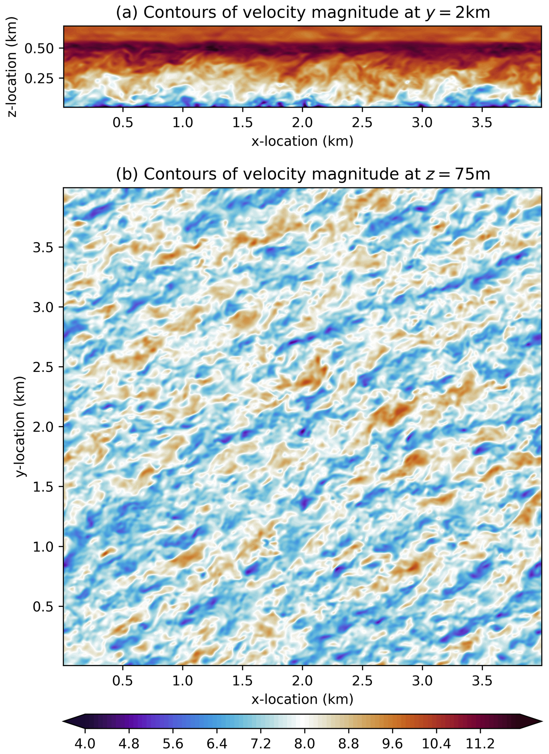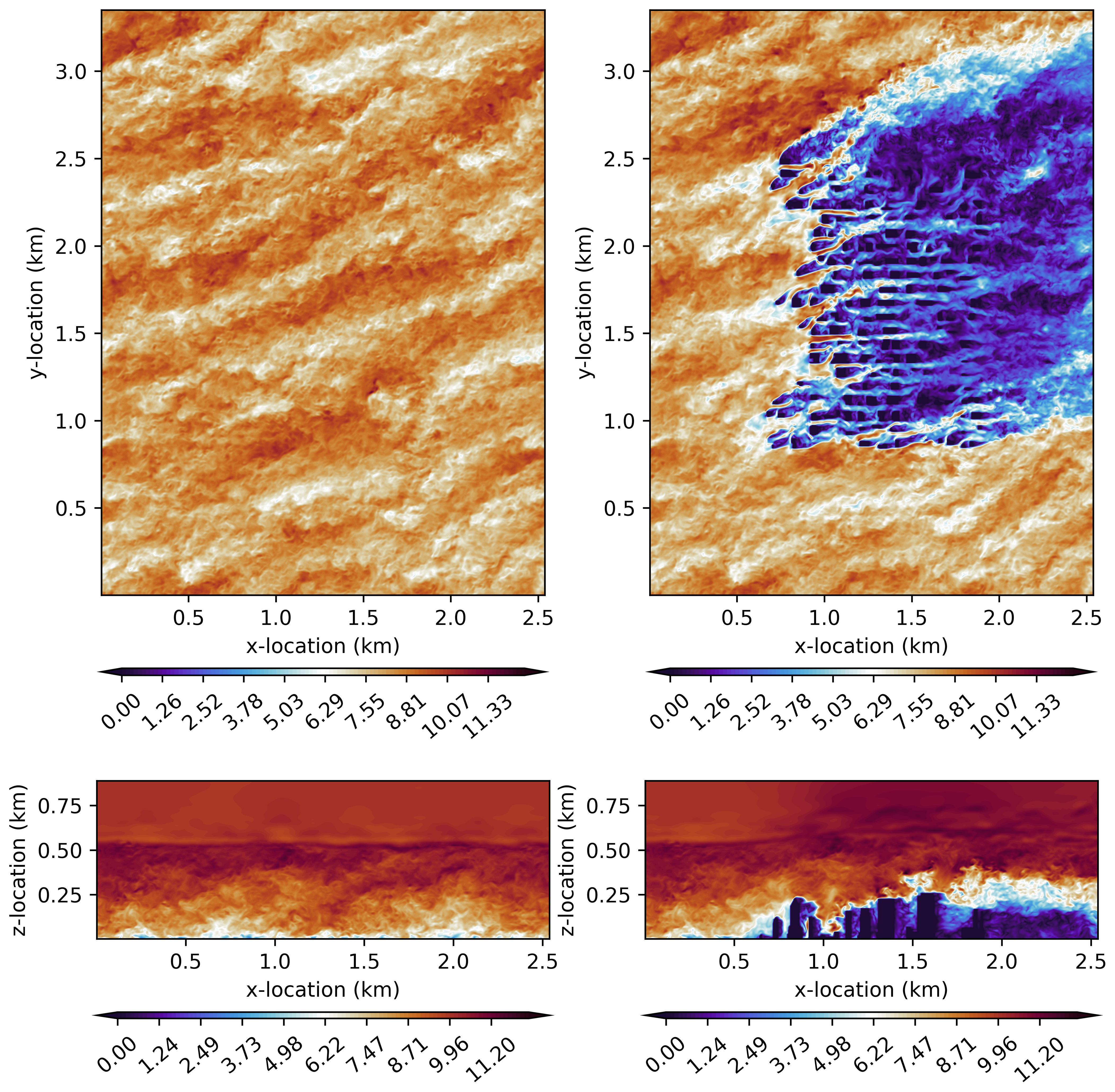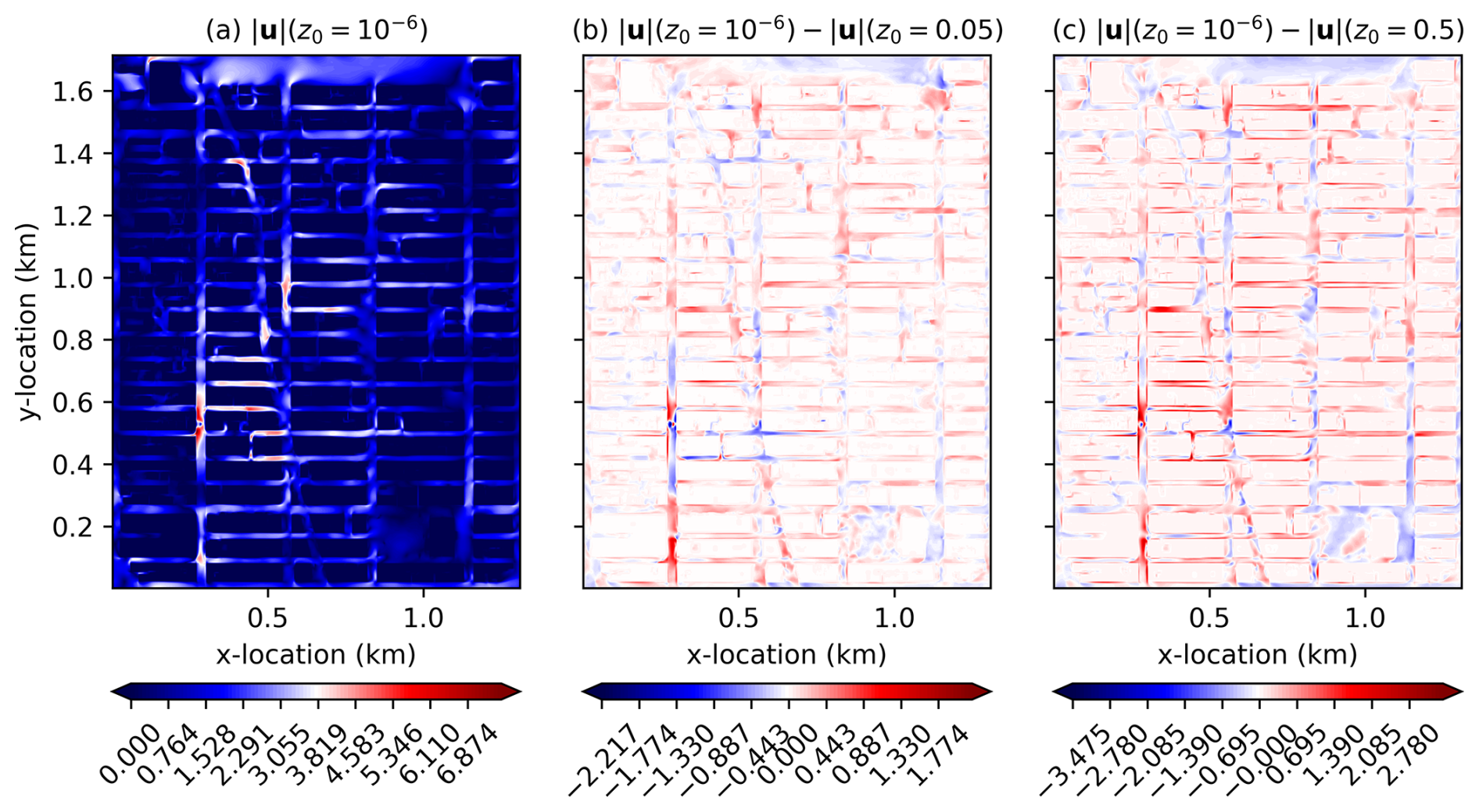Large Eddy Simulation (LES) has been an effective tool in simulating turbulent flows in complex scenarios for decades (Mason, 1994; Lesieur and Metais, 1996; Stoll et al., 2020). This study focuses on what would, atmospherically speaking, often be called “microscale” flow (Liu et al., 2012; Zhang et al., 2016), resolving grid spacings in the range [1,100] meters. This resolution is important for understanding very fine-scaled boundary layer flows with applications to wind energy (Mehta et al., 2014), urban flow (Letzel et al., 2008; Xie and Castro, 2009), and vegetation canopy flows (Shaw and Schumann, 1992; Dupont and Brunet, 2008) among other potential applications. It is a challenging scale to simulate due to the coupled effects of large-scale forcing such as incoming weather patterns as well as extremely small-scale forcing such as plant morphology and surface and building material roughness with complex geometries.