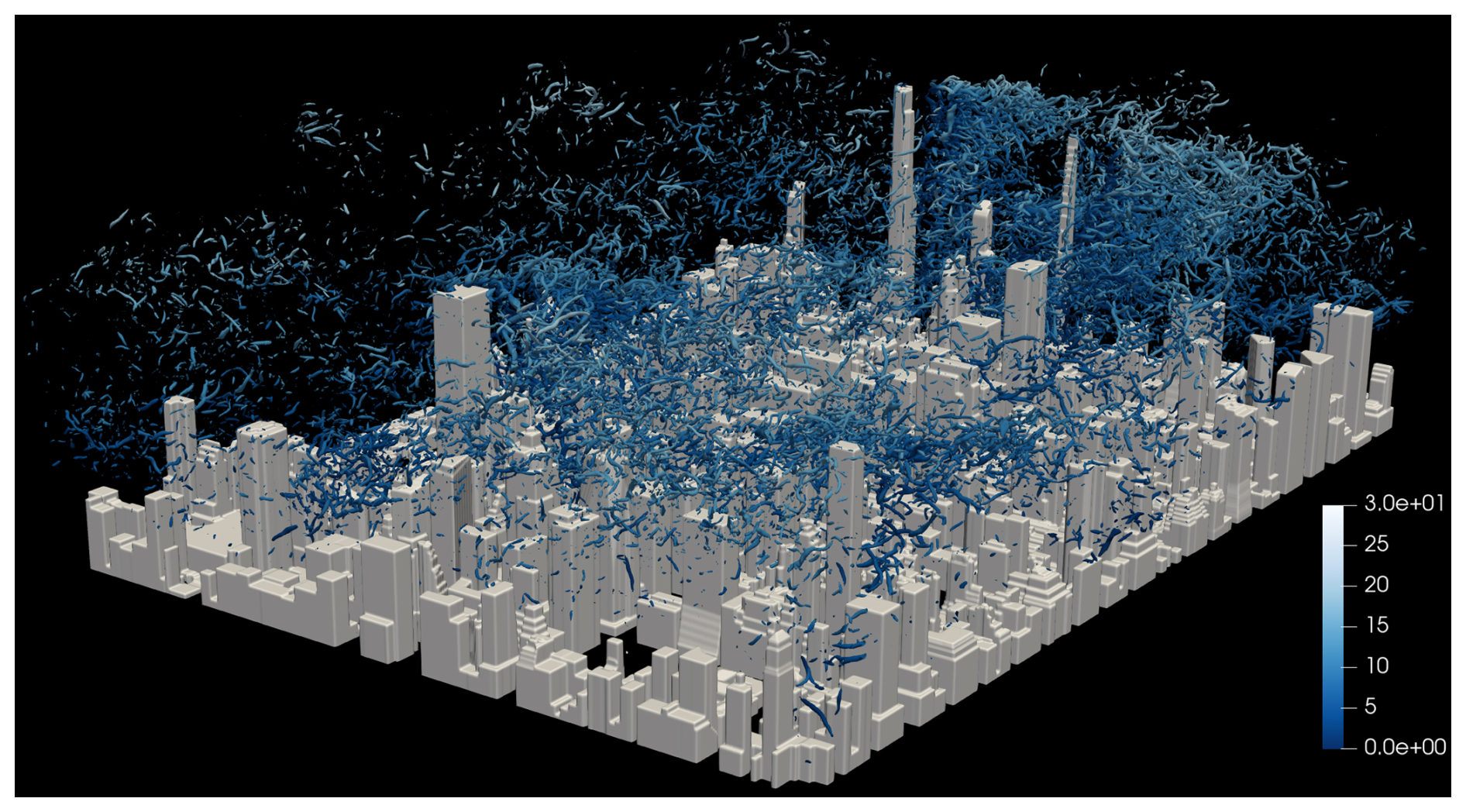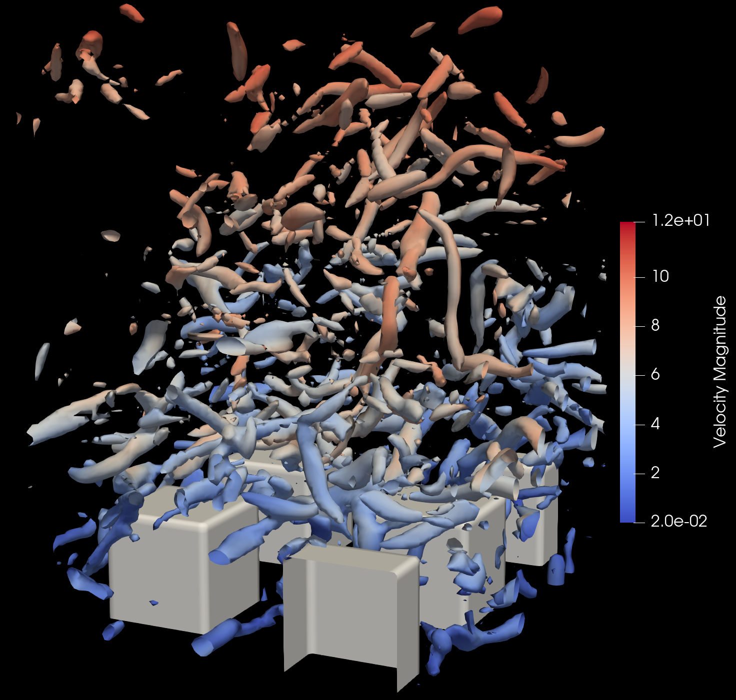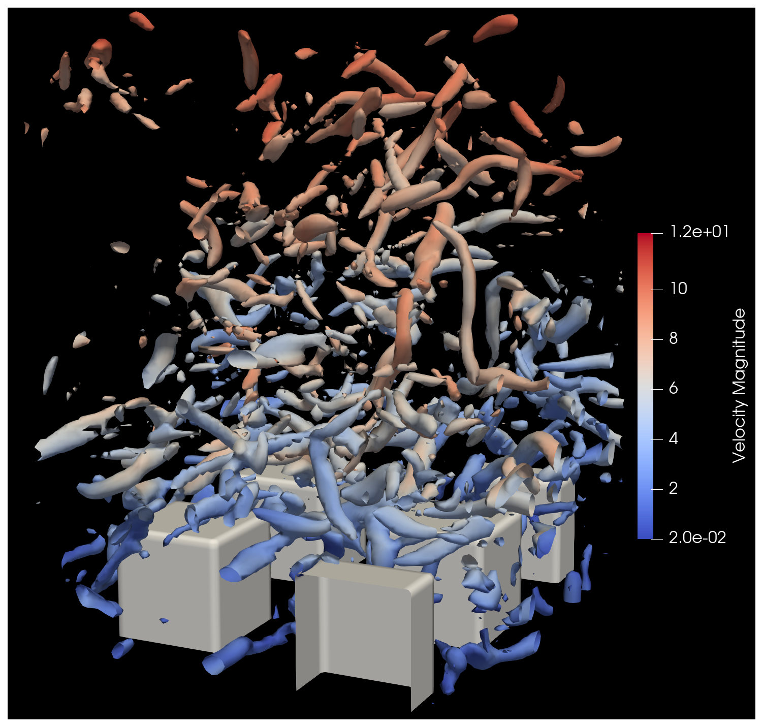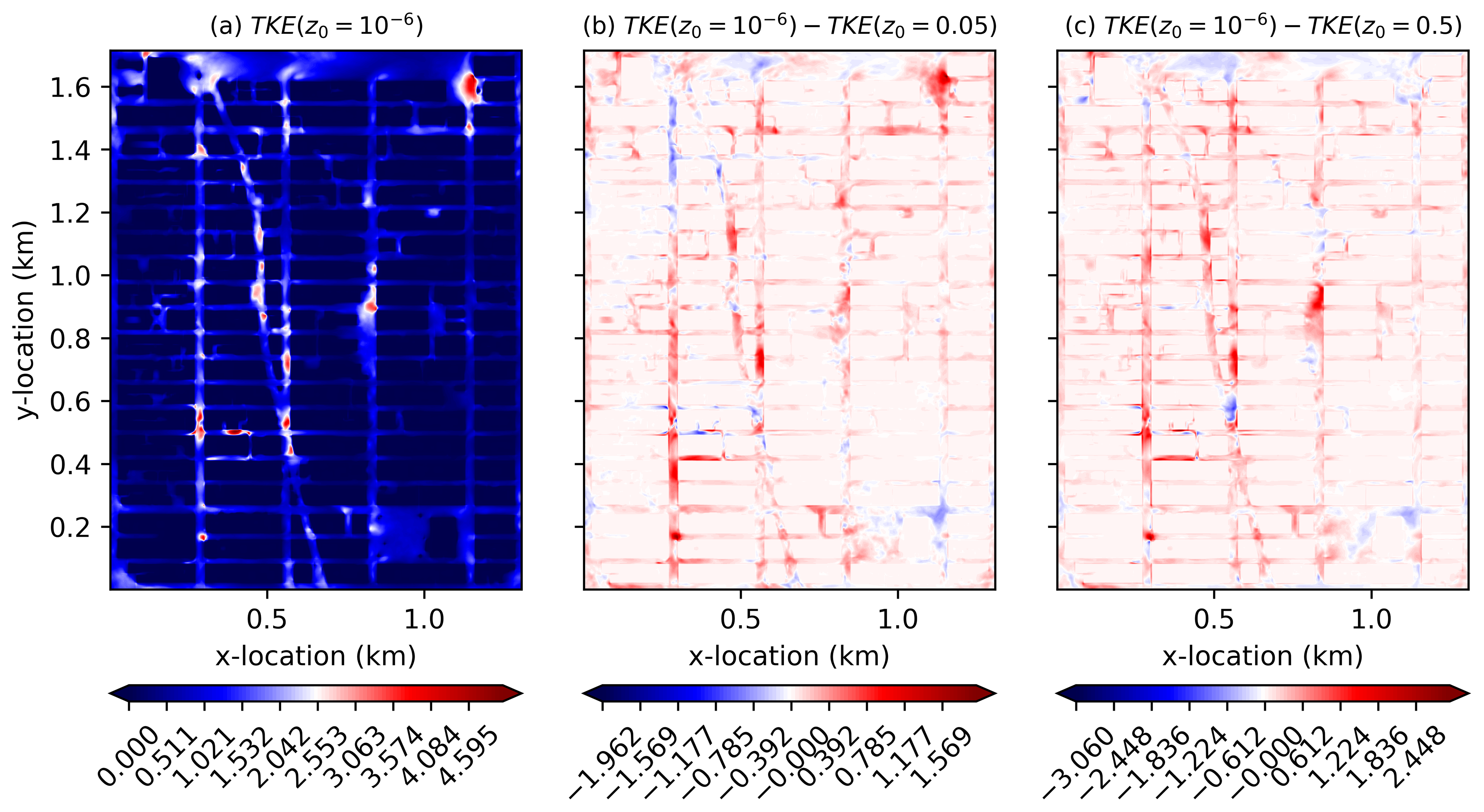 Large Eddy Simulation (LES) has been an effective tool in simulating turbulent flows in complex scenarios for decades (Mason, 1994; Lesieur and Metais, 1996; Stoll et al., 2020). This study focuses on what would, atmospherically speaking, often be called “microscale” flow (Liu et al., 2012; Zhang et al., 2016), resolving grid spacings in the range [1,100] meters. This resolution is important for understanding very fine-scaled boundary layer flows with applications to wind energy (Mehta et al., 2014), urban flow (Letzel et al., 2008; Xie and Castro, 2009), and vegetation canopy flows (Shaw and Schumann, 1992; Dupont and Brunet, 2008) among other potential applications. It is a challenging scale to simulate due to the coupled effects of large-scale forcing such as incoming weather patterns as well as extremely small-scale forcing such as plant morphology and surface and building material roughness with complex geometries.