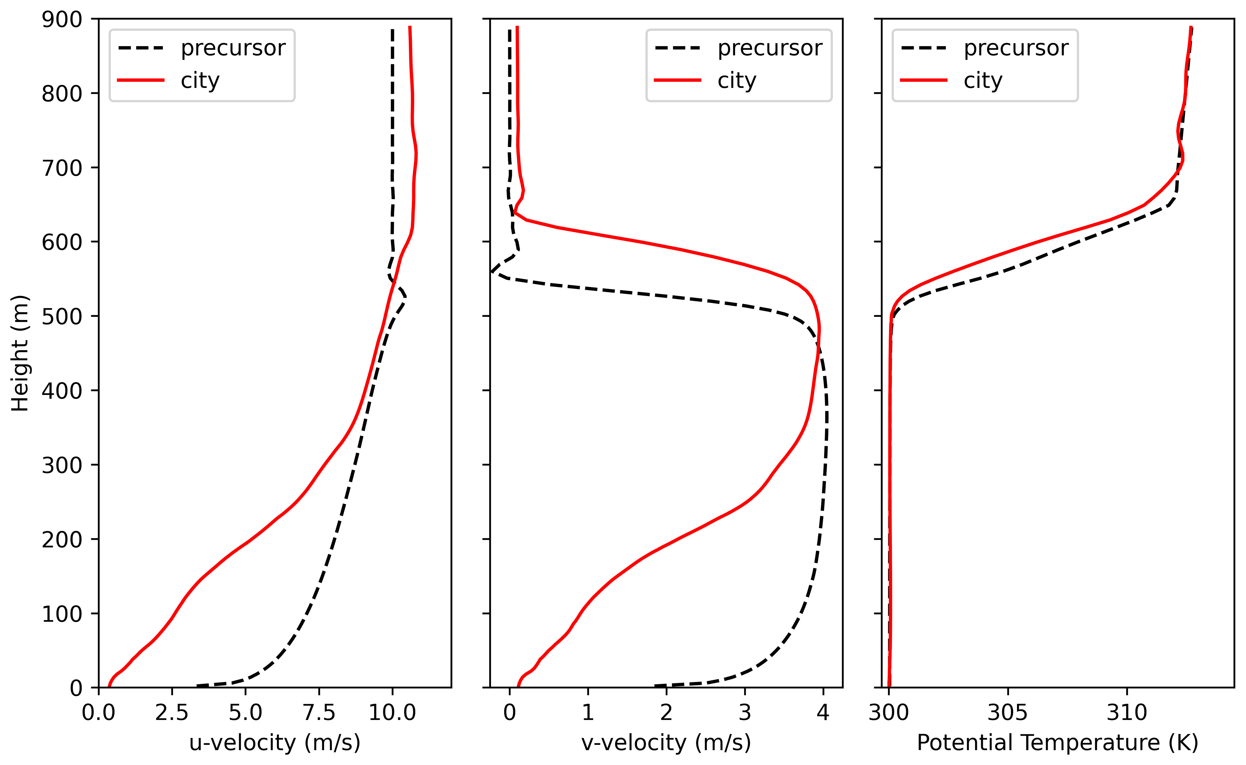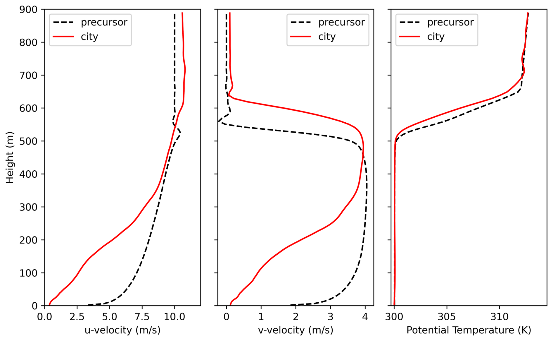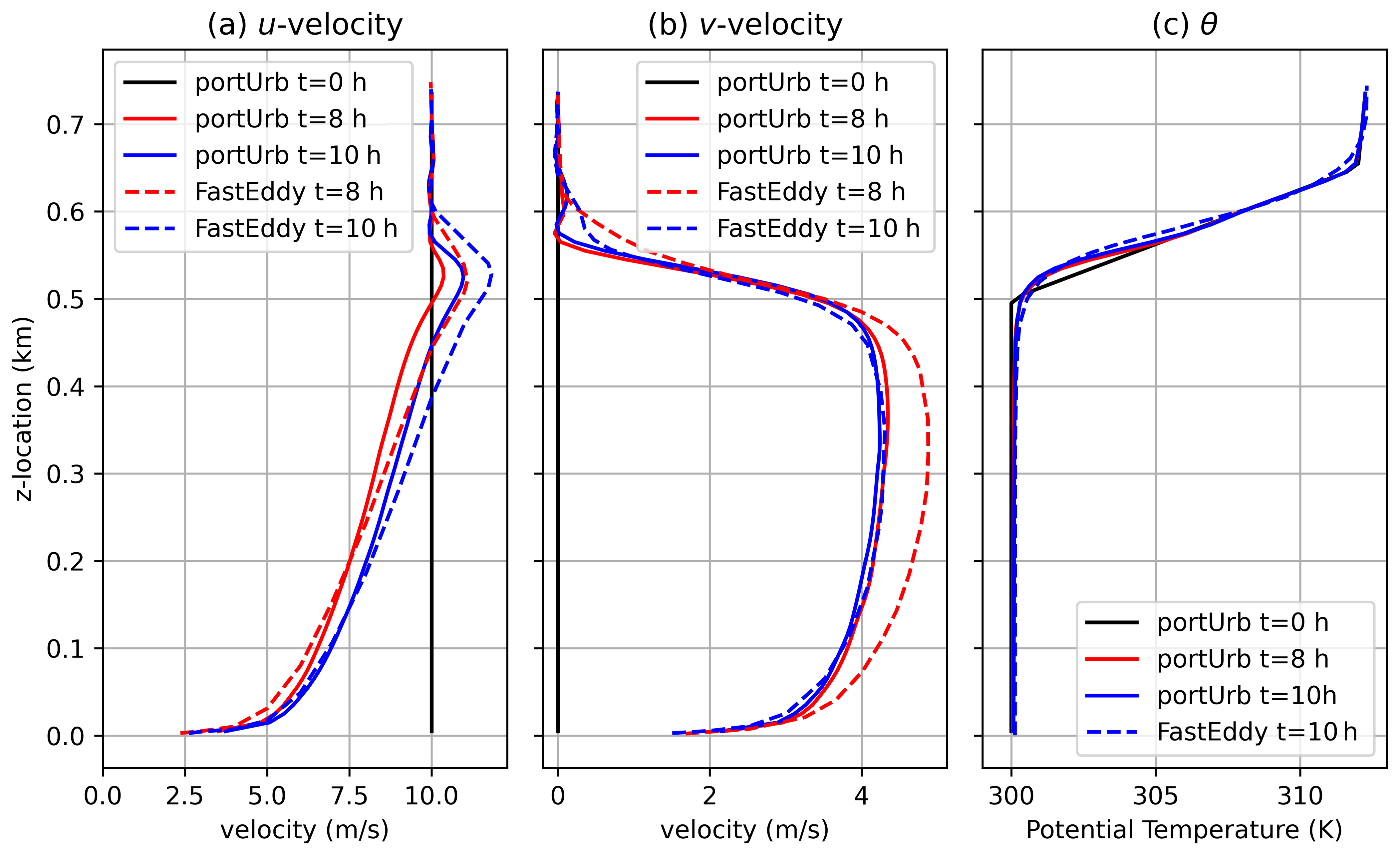 Figure 1 plots the wind magnitude for the neutral atmospheric boundary layer test case at ten model hours. The scale and angle of turbulent fluctuations as well as behavior near the inversion match that of Fig. 1 of Sauer and Muñoz-Esparza (2020). The supergeostrophic wind speed at the inversion is present as well (Pedersen et al., 2014). Figure 2 plots vertical profiles of the domain mean u and v velocities as a function of height at 8 and 10 model hours. Also plotted are the vertical domain mean profiles from Fig. 2 of Sauer and Muñoz-Esparza (2020) as comparison points. Both models show the supergeostrophic wind at the inversion and increase in wind speed from 8 to 10 model hours in both horizontal wind directions. However, the u-direction wind speed in portUrb is lower aloft and higher at the surface. The v-velocity is quite similar between portUrb and FastEddy at t=10 h, but portUrb has a smaller difference between 8 and 10 h of simulation. The potential temperature profile is also similar, showing a slight growth in the inversion height and smoothing of the initial inversion temperature discontinuity. The second potential temperature discontinuity at z=650 m is less diffused in portUrb than it is in FastEddy. The magnitudes of u-velocity and v-velocity are slightly lower in this study, possibly due to the use of a larger grid spacing, but the structure remains similar.