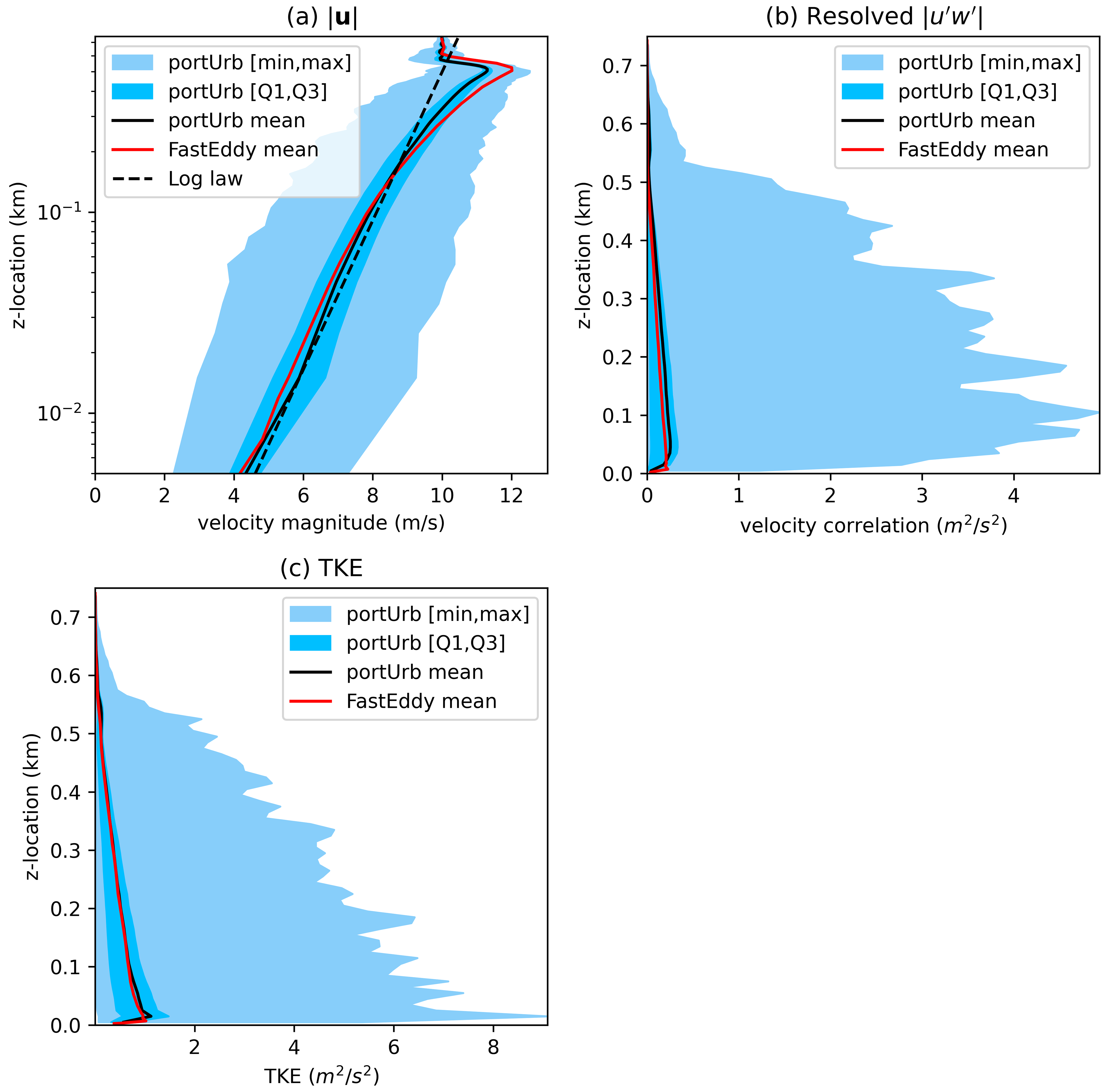 Figure 3 shows plots of mean values, minimum to maximum ranges, and the first and third quartiles for wind speed, correlation, and total Turbulence Kinetic Energy (TKE). Also plotted are the mean data from Fig. 3 in Sauer and Muñoz-Esparza (2020) for comparison. A sharp peak in TKE is observed near the surface, decaying toward zero aloft. The TKE for portUrb is in quite close agreement with FastEddy. A log profile of wind speed increase from the frictioned bottom boundary is shown in Fig. 3a using reference height of 500 m and a reference wind speed of 10 m s−1 for the log-law reference. The horizontal mean resolved correlation reaches a slightly larger peak magnitude in this study and does so more smoothly than observed in Sauer and Muñoz-Esparza (2020), possibly due to the use of WENO limiting, a fully upwind flux, or a coarser grid spacing. A plot of the wind speed spectra averaged among 1-D FFTs in the two horizontal directions at a height of z=75 m are given in Fig. 4, showing an effective resolution of about 8Δx and perhaps slightly higher. No accumulation of energy is observed at 2Δx scales, demonstrating physically realizable dissipation of energy at the end of the 3-D cascade by the numerical discretization and SGS turbulence closure.