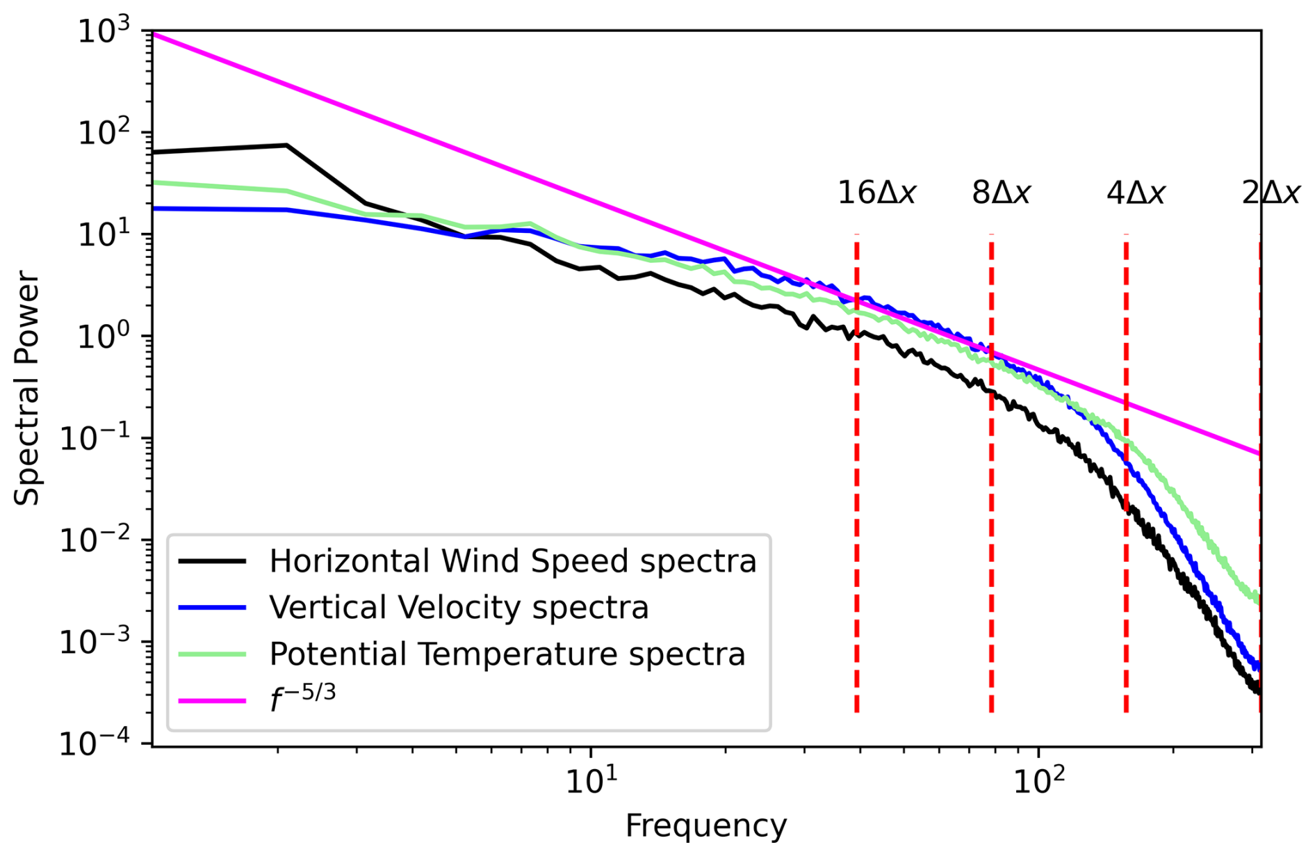 Figure 6 shows the spectral power of FFTs of horizontal wind, vertical wind, and potential temperature at a height of z=75 m at t=2 h. The resolution of potential temperature (treated quite similarly to tracers in the dynamics) is somewhat better than that of the horizontal and vertical velocities. This is likely due to differences in the diffusion where velocities use a stress tensor and tracers use a second-order diffusion operator. All of these quantities are resolved (from a spectra magnitude perspective) at a scale of roughly 4−8Δx, keeping in mind that spectra do not always provide seemingly physically realizable results for physical reasons (Norman et al., 2023b). In this simulation, though, the flow is absent of Runge oscillations, grid point convection cells, and grid-scale energy accumulation.