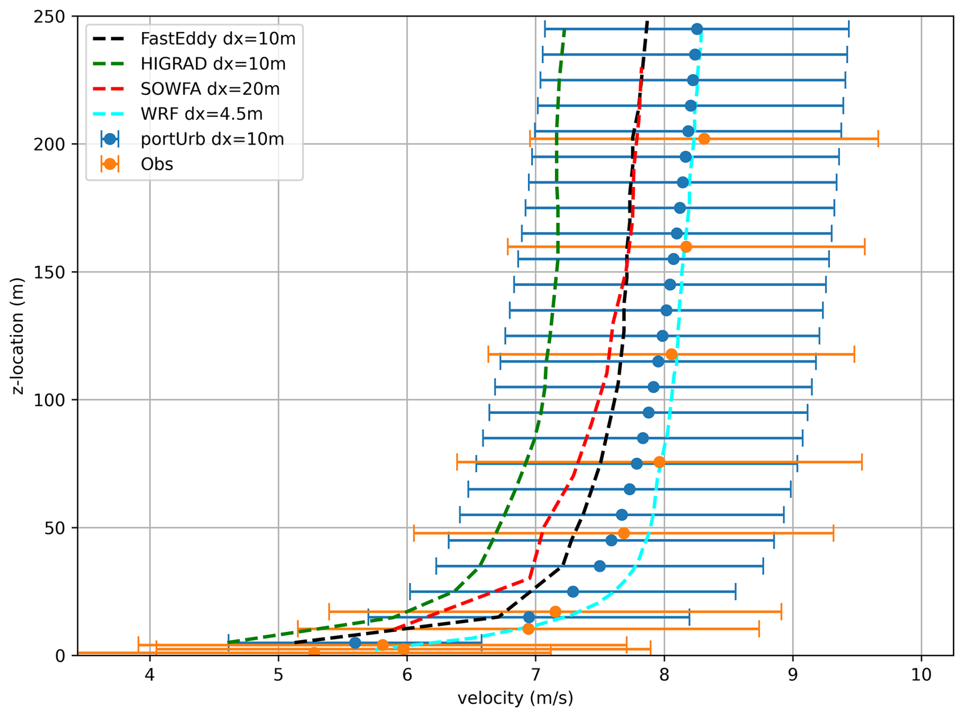 Figure 7 plots mean velocity magnitude along with the mean range of one standard deviation (with regard to deviations in time), averaged between 2 and 3 h of simulation, for the portUrb simulation along with the mean and one standard deviation range of observations from the Sandia National Laboratories Scaled Wind Farm Technology (SWiFT) field experiment (Kelley and Ennis, 2016) and four model mean velocities for comparison: WRF, SOWFA, HiGrad (Mirocha et al., 2018), and FastEddy (Sauer and Muñoz-Esparza, 2020). The portUrb results are the closest to observations, though this is partly due to a quick tuning for geostrophic wind forcing and surface heat flux values (similar to the tuning procedure of Mirocha et al. (2018) in Table 2). Two different simulations were run for portUrb: (1) with uG=9 m s−1 with 0.35 K m s−1 heat flux; and (2) uG=10 m s−1 with 0.4 K m s−1 heat flux. The latter option performed better, and those are the results shown here.