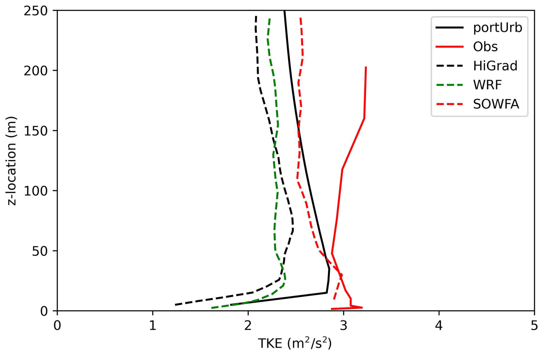 Figure 8 plots time-averaged total TKE between 2 to 3 h as well as observed TKE and results from three other models. PortUrb gives very similar TKE results to the SOWFA code and is close to observations in m. None of the LES models maintain a consistent TKE in m as seen in the observations, however. This may simply be due to the observed boundary layer being more developed than the simulations' boundary layers.