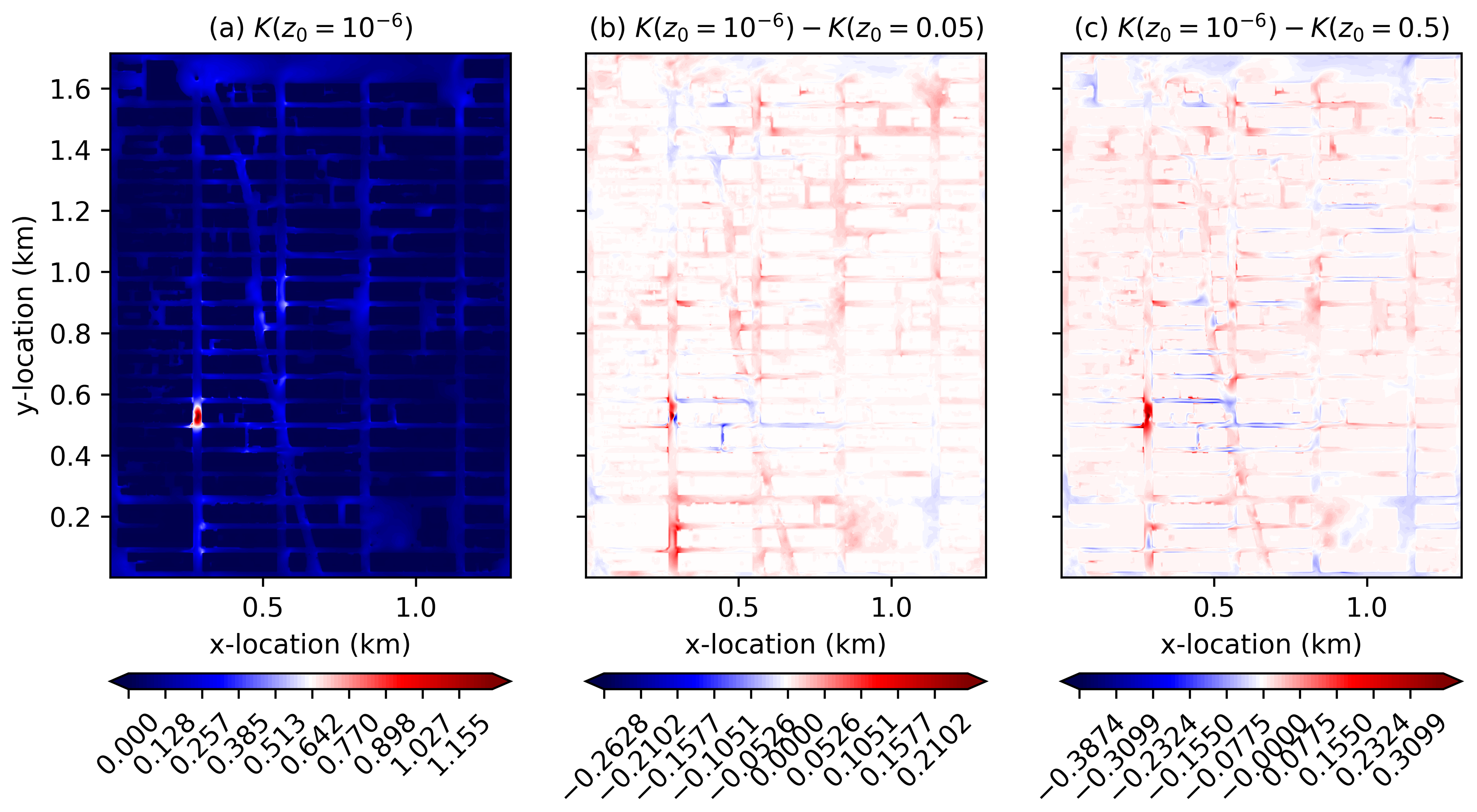 Surface fluxes at the model surface and at immersed boundaries are enforced with Monin–Obukhov similarity theory (Monin and Obukhov, 1954). For all surface cells, and for all cells adjacent to an immersed cell, surface fluxes in each direction are applied via the following flux terms in a corresponding manner as the eddy fluxes in Eq. (1):