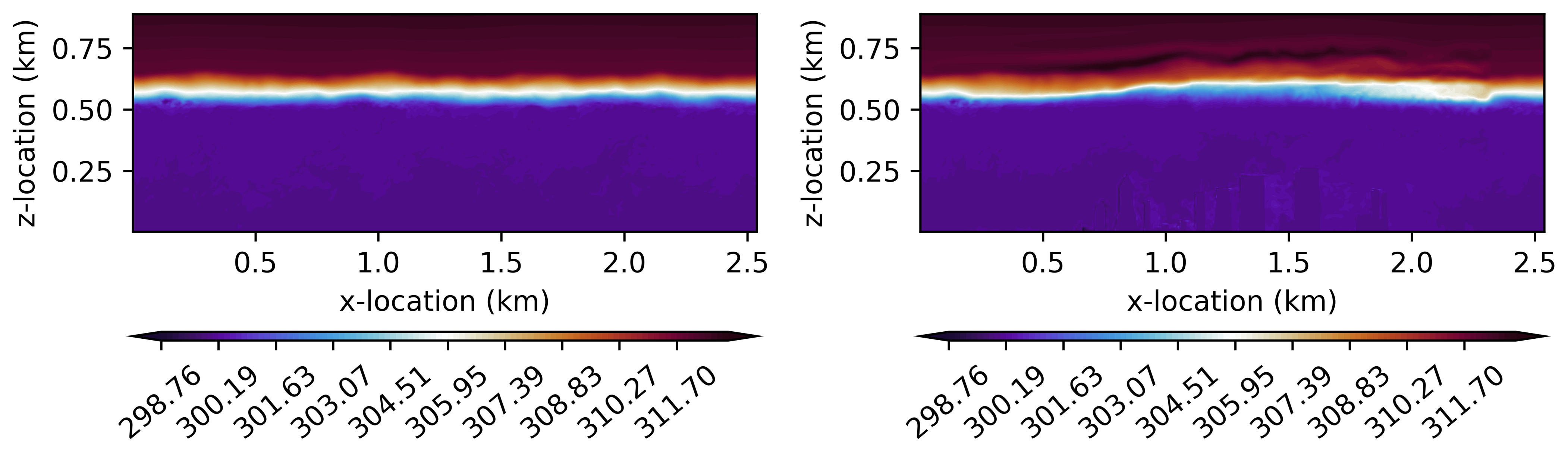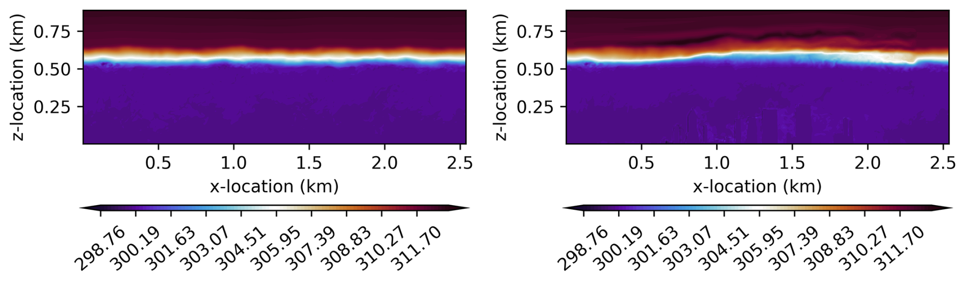 Figure 5 plots the potential temperature and vertical velocity at z=75 m as well as y=3 km at a time of t=2 h. Comparing this against Fig. 8 of Sauer and Muñoz-Esparza (2020) and Fig. 3 of Mirocha et al. (2018), the scale of structures are similar. The inversion height appears to be a bit more smoothed out and lower than WRF in Mirocha et al. (2018) and roughly the same as SOWFA and HiGrad. The inversion appears to have roughly the same smoothness as FastEddy (Sauer and Muñoz-Esparza, 2020) but is a bit lower in height. The magnitude of updrafts are similar to FastEddy in Fig. 8 of Sauer and Muñoz-Esparza (2020).