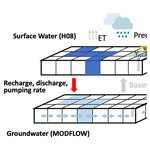 To investigate the river-aquifer exchanges, a river package (RIV) is used. The water flux exchanges are calculated based on the head difference between river channels and the aquifer cells, i.e., water leaks from the river channel to the aquifer when the river water level is higher than the groundwater head and vice versa, as: