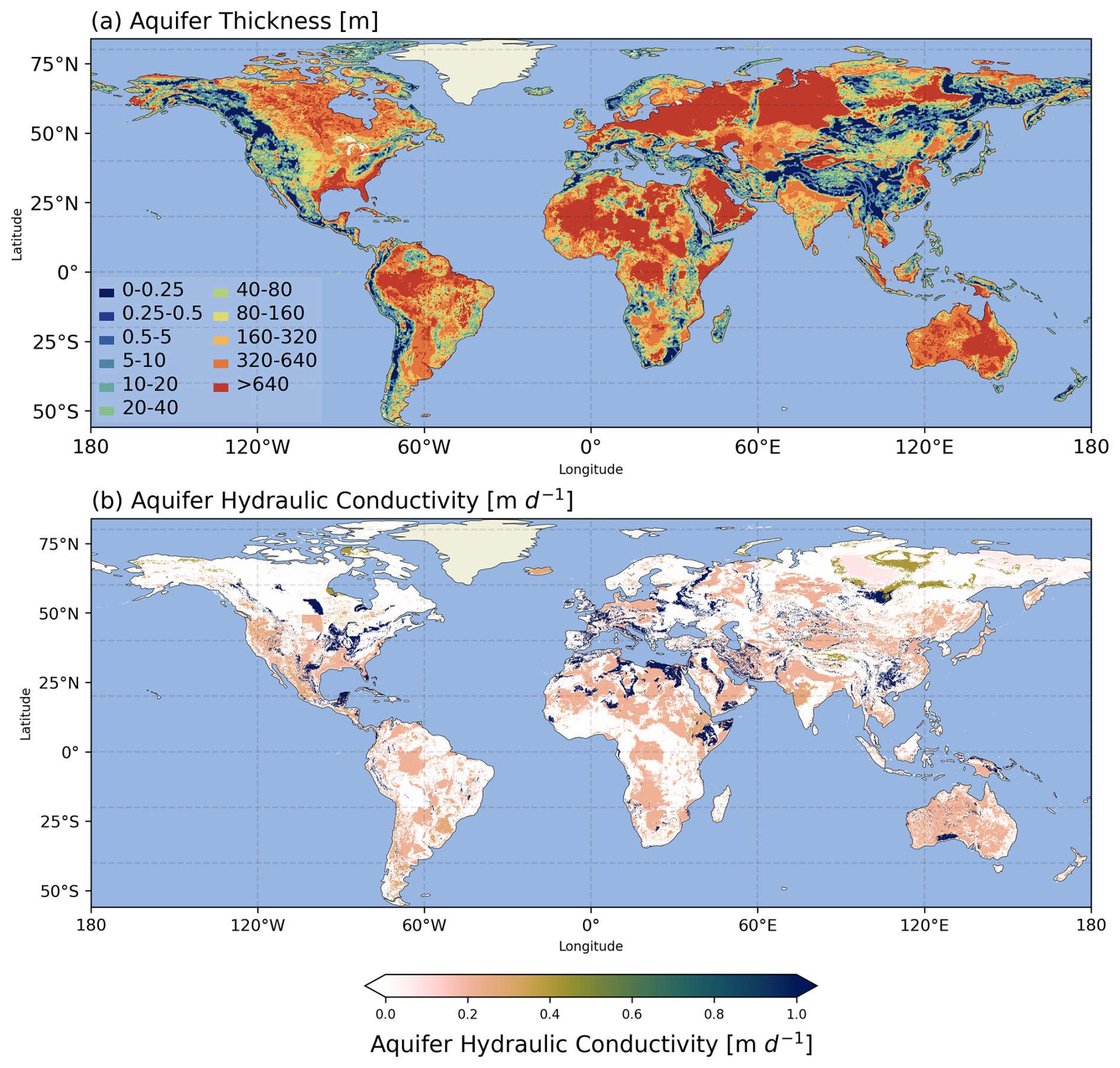 Figure 3Global distribution of aquifer thickness (a) and aquifer hydraulic conductivity (b). The aquifer thickness product is from de Graaf et al. (2015), and aquifer hydraulic conductivity is based on GLiM lithological map (Hartmann and Moosdorf, 2012) and GLHYMPS (Gleeson et al., 2011, 2014)