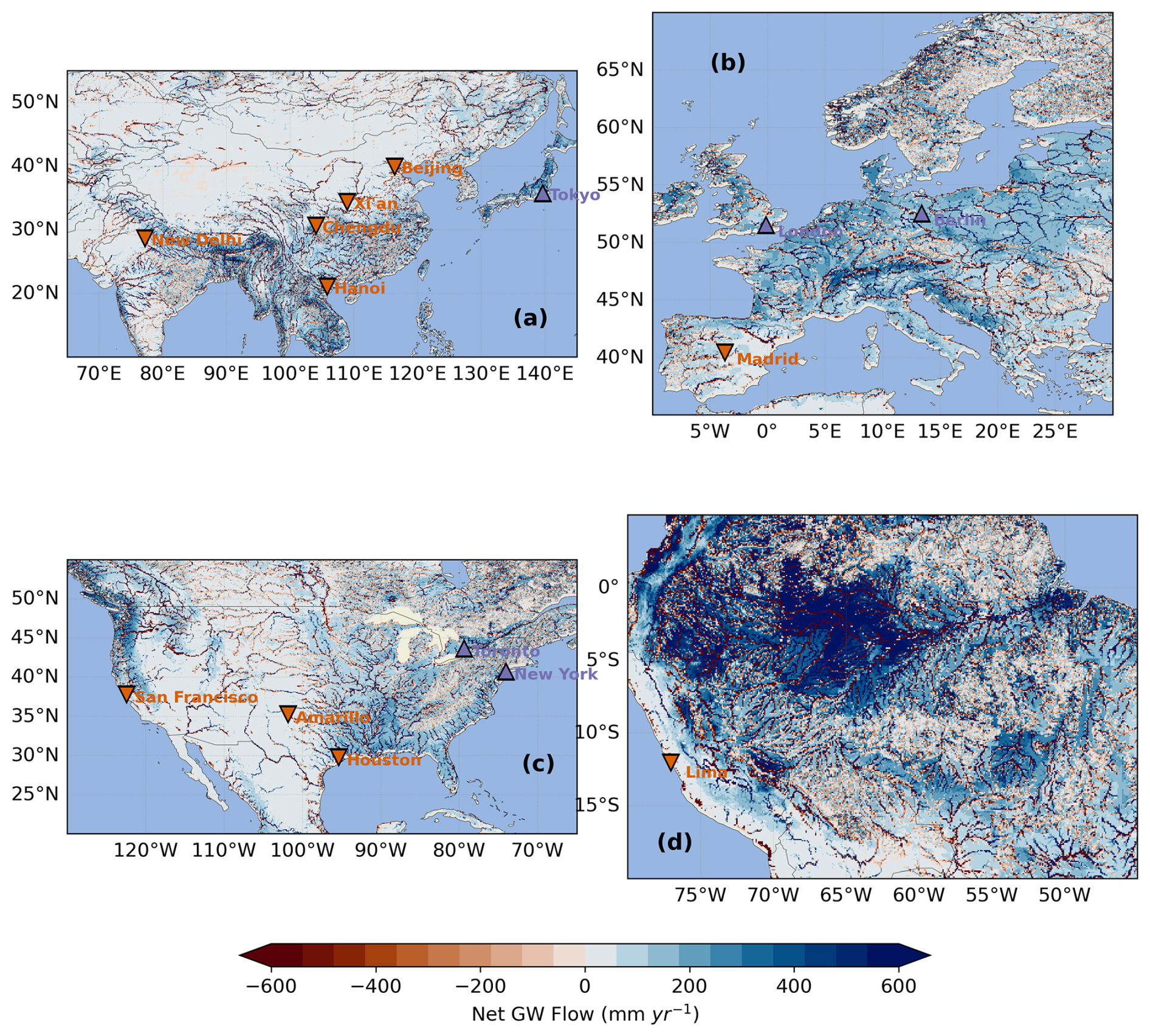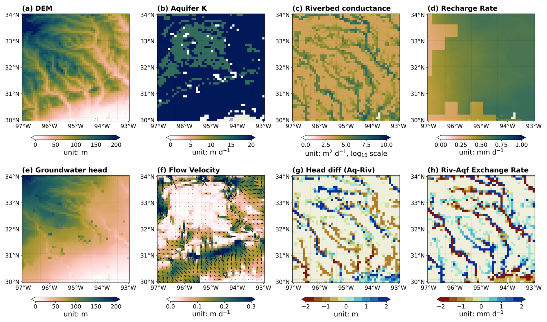 Groundwater plays a critical role in the global hydrological cycle. The water exchange between aquifers and surface water bodies buffers the sharp seasonal fluctuations in river channels and lakes, maintaining the resilience of aquatic landscapes and ecosystems (Huggins et al., 2023; Jasechko et al., 2021; Otoo et al., 2025; Rohde et al., 2024a, b; Saccò et al., 2024). Such surface-groundwater exchange can also contribute to a significant amount of rainfall and evapotranspiration variability in arid and semi-arid regions (Bierkens and Van Den Hurk, 2007; Condon and Maxwell, 2019; Schaller and Fan, 2009), therefore mitigating the severity of droughts and heatwaves through land–atmosphere interactions (Keune et al., 2016; Kollet and Maxwell, 2008; Maxwell et al., 2007; Mu et al., 2022).