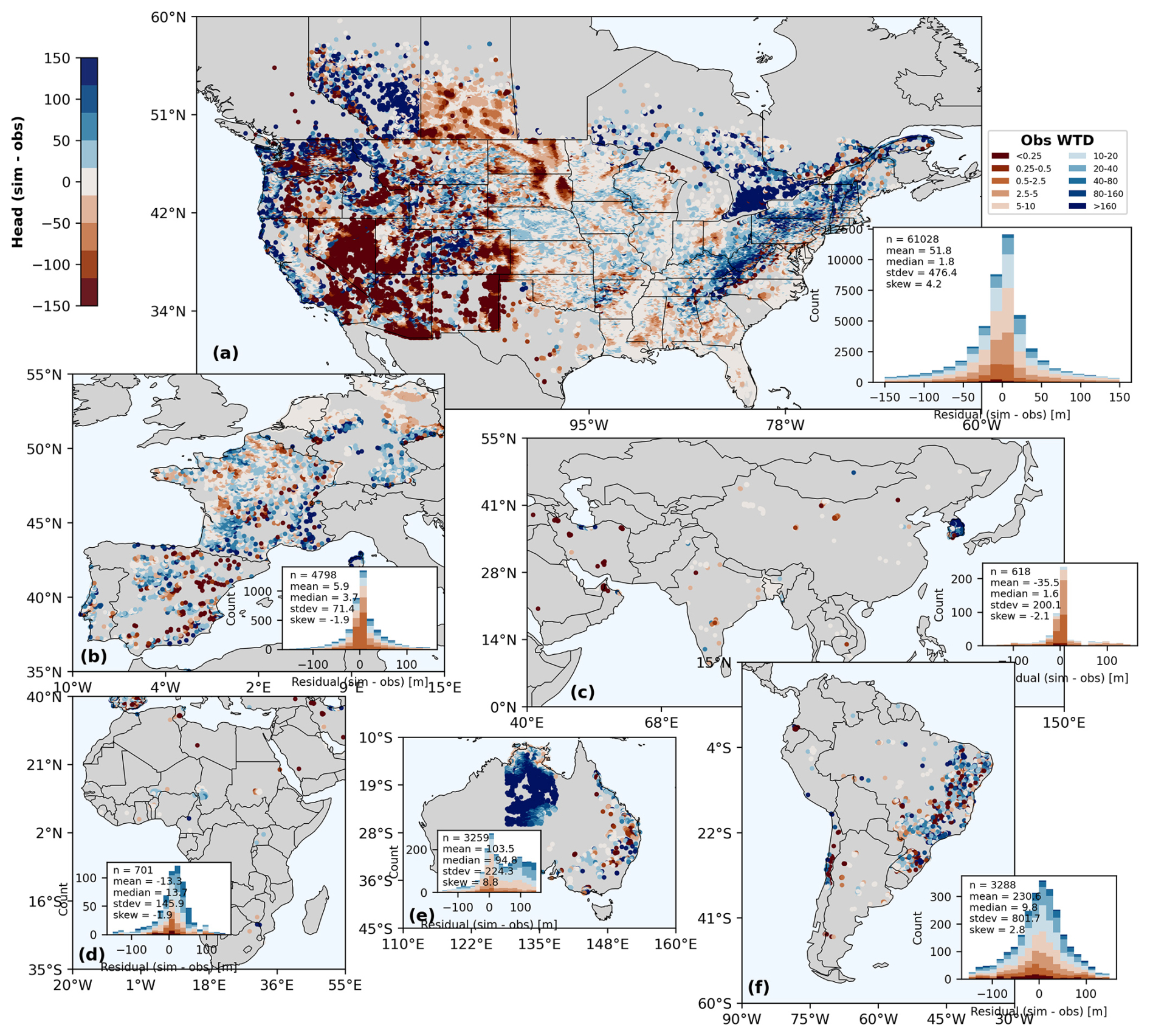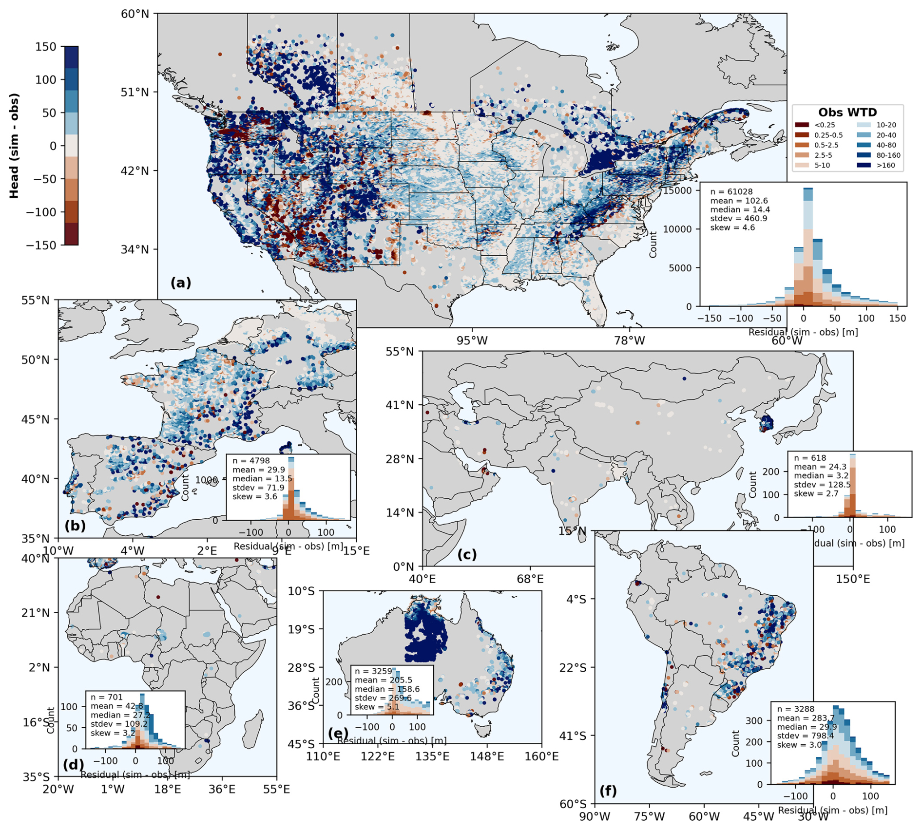 Figure 8Validation of simulated WTD against observations over each continent: (a) North America; (b) Europe; (c) Asia; (d) Africa; (e) Australia; and (f) South America. Grid cells are masked when either variable is marked as missing value. The missing values mainly concentrate in western Australia (e), which results in a sharp edge in the centre of this region. The inset panels are histograms of the model–observation head residuals (h–ho) over each continent, with bar heights showing the count of sample pairs; the overlaid text annotations indicate the statistics of that residual distribution (mean, median, standard deviation, skewness).