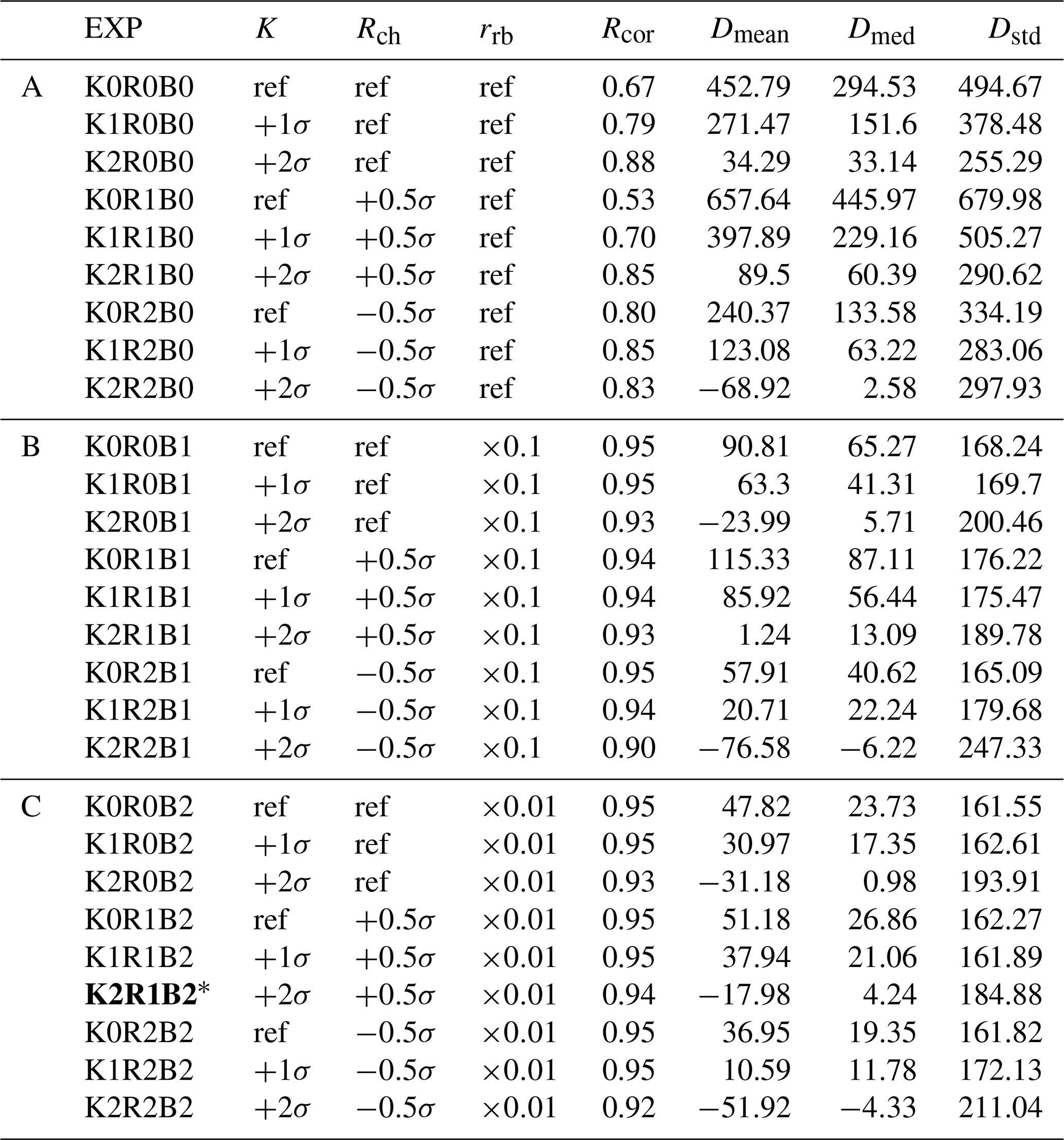 To maintain computational efficiency, for each parameter we did three sensitivity analyses. Together this results in 27 experiments in total (Table 1). We take K0R0B0 as the reference experiment (ref), and use Correlation Coefficient (R), Mean, Median, and Standard Deviation of the difference between simulation and observation (Dmean, Dmed, Dstd) to evaluate the performance of each experiment against observations. For parameters of K and RCH, one and two standard deviations are added individually for each relevant experiment. The statistic for K is from Gleeson et al. (2011) directly, while for RCH it is calculated based on groundwater recharge from H08 monthly simulation output (January 1979–December 2019). Note that although the aquifer thickness data we use is for deep aquifers while Gleeson et al. (2011) only provides such information for the shallow, here we assume there is similarity in aquifer thickness statistics between the two layers, similar to the assumption in the derivation of the dataset we use. For RRD, because there is no global reference of how its statistics should look like, rather simplistic scale factors are applied, i.e., 0.1 and 0.01 d are taken for different experiment settings.