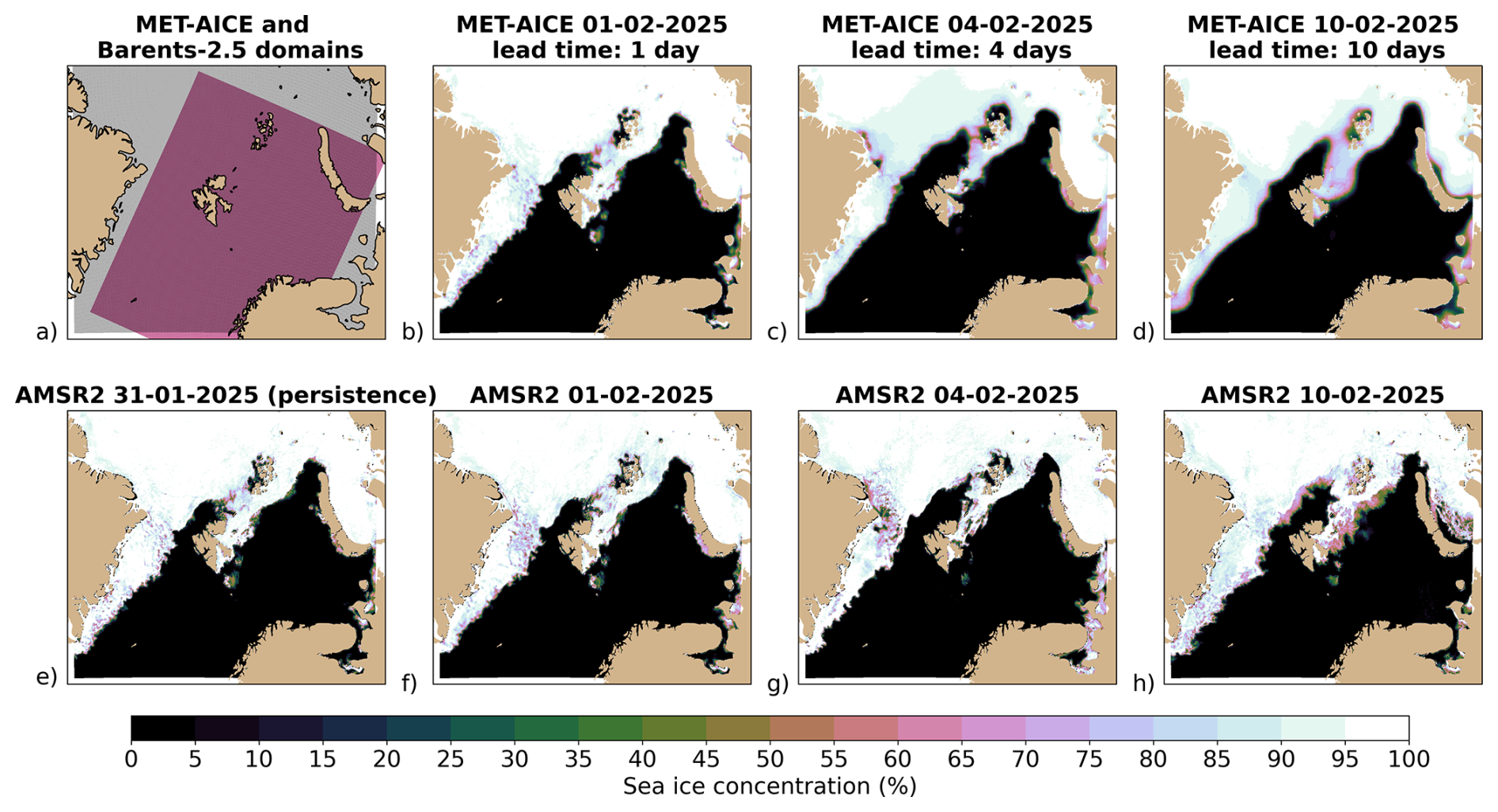 Figure 2(a) Domains of MET-AICE (gray) and Barents-2.5 (purple). Comparison between the MET-AICE forecasts initialized on the 1 February 2025 at 00:00 UTC (b–d) and the AMSR2 sea ice concentration observations for the corresponding days (f–h). (e) The AMSR2 observations from the day preceding the forecast start date that are used as a predictor in the MET-AICE forecasts initialized on 1 February 2025.
