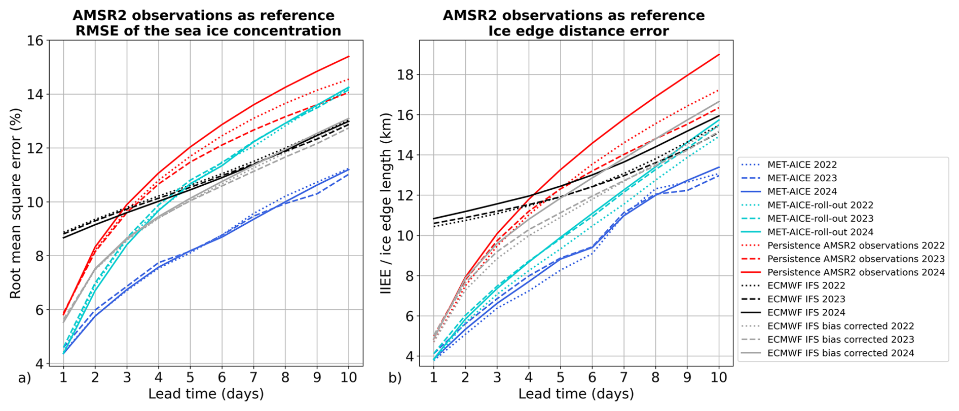 Figure 4Performances of MET-AICE and ECMWF IFS during the years 2022, 2023, and 2024 over the full MET-AICE domain using AMSR2 observations as reference. MET-AICE-roll-out corresponds to using the MET-AICE model for a 1 d lead time auto-regressively to predict the sea ice concentration for lead times up to 10 d. (a) Root mean square error (RMSE) of the sea ice concentration. (b) Evaluation of the ice edge position (defined by the 10 % sea ice concentration contour).