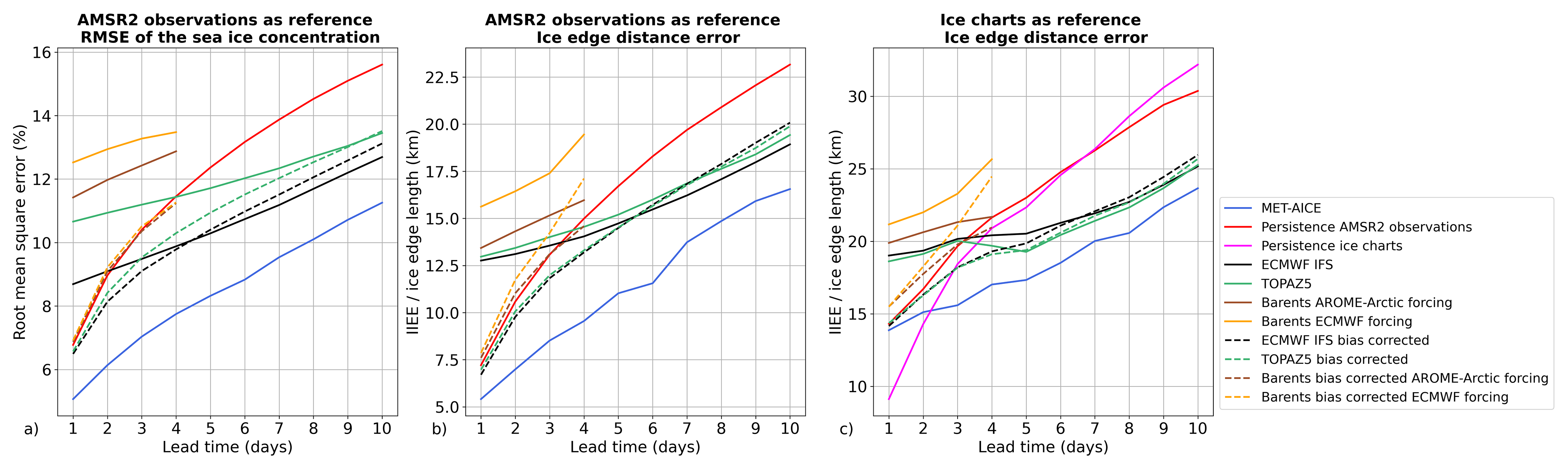 Figure 5Performances of MET-AICE, ECMWF IFS, TOPAZ5 and Barents-2.5 during the period April 2024–March 2025 over the shared domain between MET-AICE and Barents-2.5. (a) Root mean square error (RMSE) of the sea ice concentration using AMSR2 observations as reference. (b) Evaluation of the ice edge position (defined by the 10 % sea ice concentration contour) using AMSR2 observations as reference. (c) Evaluation of the ice edge position using the ice charts as reference.