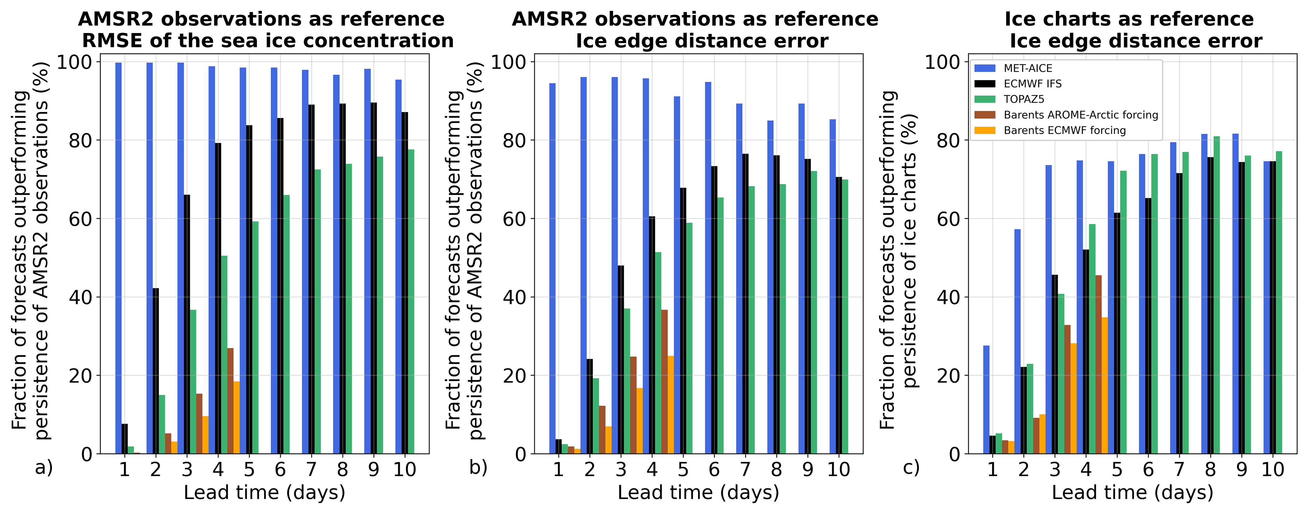 Figure 6Fraction of days during which the forecasts outperform persistence of AMSR2 observations for the root mean square error of the sea ice concentration (a) and the ice edge position (b) using AMSR2 observations as reference during the period April 2024–March 2025. (c) Fraction of days during which the forecasts outperform persistence of the ice charts for the ice edge position using the ice charts as reference. The forecasts are evaluated over the shared domain between MET-AICE and Barents-2.5.