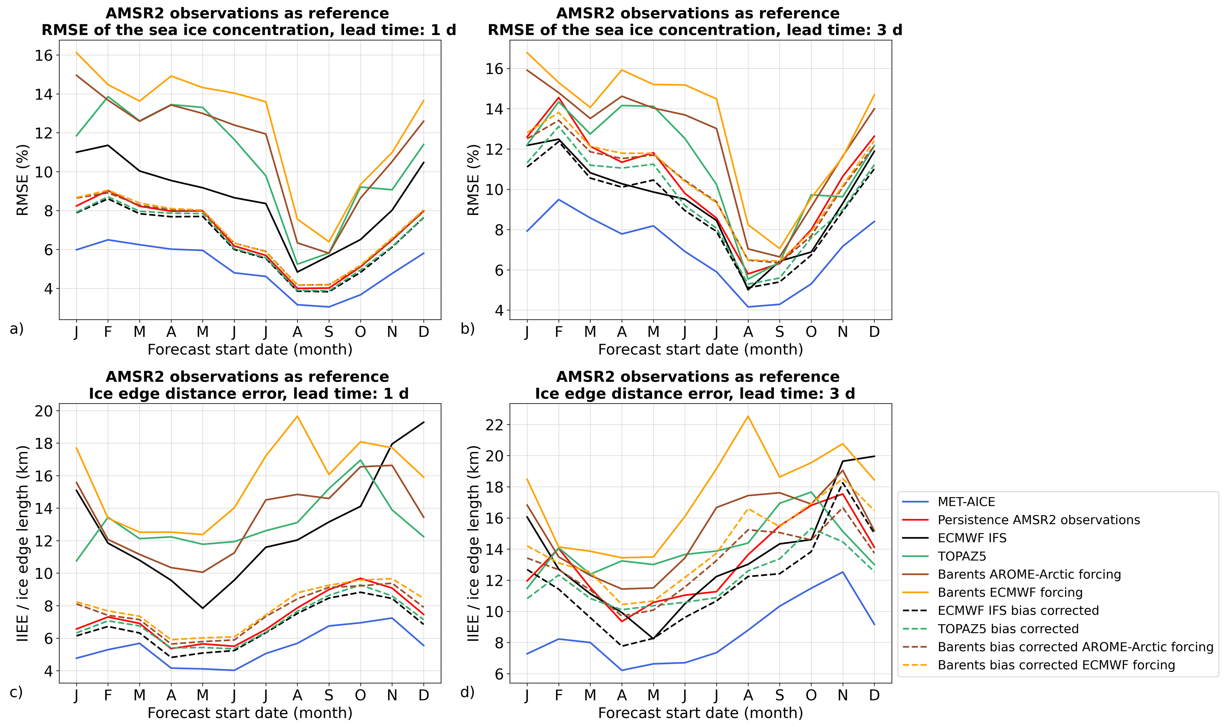 Figure 7Seasonal variability of the performances of MET-AICE, ECMWF IFS, TOPAZ5, and Barents-2.5 for 1 and 3 d lead times using AMSR2 observations as reference during the period April 2024–March 2025. (a, b) Root mean square error (RMSE) of the sea ice concentration. (c, d) Evaluation of the ice edge position (defined by the 10 % sea ice concentration contour). The forecasts are evaluated over the shared domain between MET-AICE and Barents-2.5.