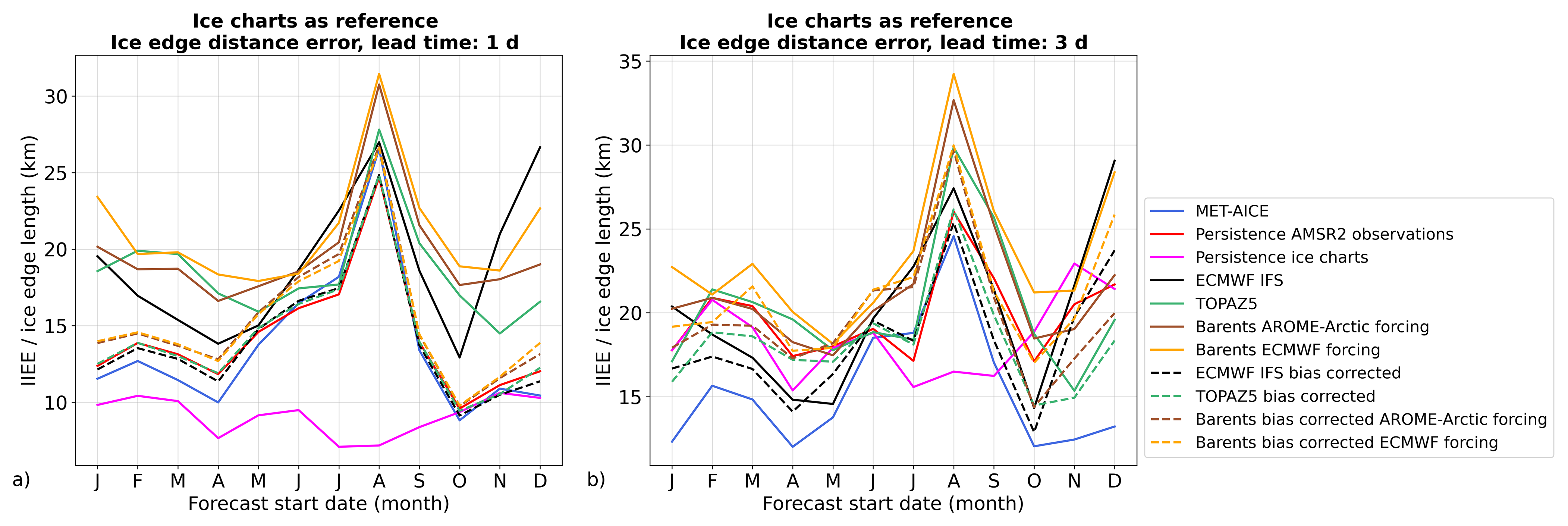 In this study, the SIC and the ice edge position (defined by the 10 % SIC contour and excluding coastlines) are evaluated. In order to assess the quality of SIC forecasts, the root mean square error (RMSE) of the SIC is calculated over all oceanic grid points using AMSR2 observations as reference. Since the ice charts do not provide SIC as a continuous variable but as sea ice classes, the ice charts are only used for evaluating the ice edge position. The ice edge position in deterministic forecasts is evaluated using the ratio of the Integrated Ice Edge Error (IIEE, Goessling et al., 2016) over the length of the ice edge in the observations used as reference (hereafter referred to as “ice edge distance error”, Eq. 1). This metric was introduced by Melsom et al. (2019) and provides the mean distance between the ice edges in the forecasts and in the observations. It is worth noting that normalizing the IIEE by the ice edge length (calculated using the method described in Melsom et al., 2019) allows to use a metric which is not seasonally dependent, contrary to using the IIEE without normalization (Goessling et al., 2016; Palerme et al., 2019).