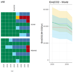 While the data output of validateScenarios can be used in any preferred way, two specific visualization approaches are offered to users of piamValidation. The function validationHeatmap provides a quick overview of the general outcome of a validation by laying out the validation result colors across up to four dimensions. This means that the five-dimensional IAM data objects need to be reduced to a single element in only one dimension. By default, the “variable” dimension is chosen for this. An example can be seen in Fig. 3 where “region” and “period” are chosen for the x- and y-axis respectively and “scenario” and “model” are plotted as x- and y-facets.