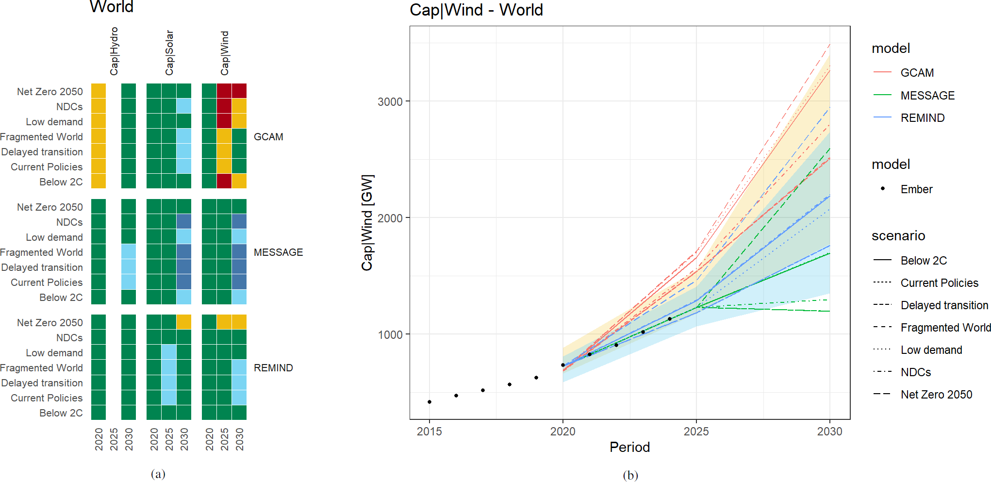 In Sect. 3, we present two complementary application cases of the piamValidation tool. The first, based on scenarios of the Network for Greening the Financial System (NGFS), illustrates its general applicability across diverse contexts, with an emphasis on demonstrating application types rather than results. The second applies piamValidation to evaluate and strengthen the near-term realism of technology trends in the IAM REMIND (REgional Model of Investment and Development, see Baumstark et al. (2021) for details). In the REMIND case study we show how the piamValidation tool can be used to first spot the deviations to historical and outlook data and then demonstrate performance improvements near-term realism focusing on offshore wind capacity, carbon management, and electric cars. The rationale for choosing these technologies is twofold: first, the feasibility of their near-term scaling has severe implications for scenarios with high ambition for emissions reduction (Brutschin et al.2021; Bertram et al.2024); second, the piamValidation tool highlighted relatively large deviations in these variables between the REMIND scenarios and historical data as well as current technology trends. We then present strategies that have been implemented to improve REMIND, and we demonstrate that subsequent scenarios improve their near-term realism.