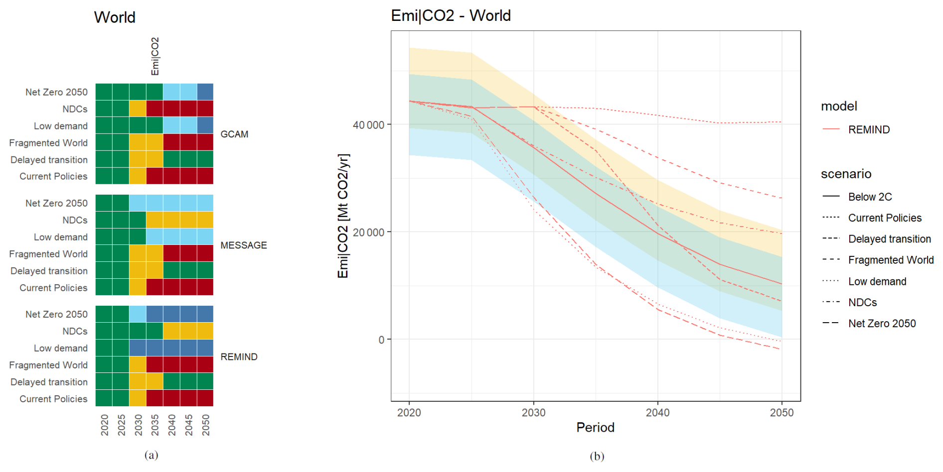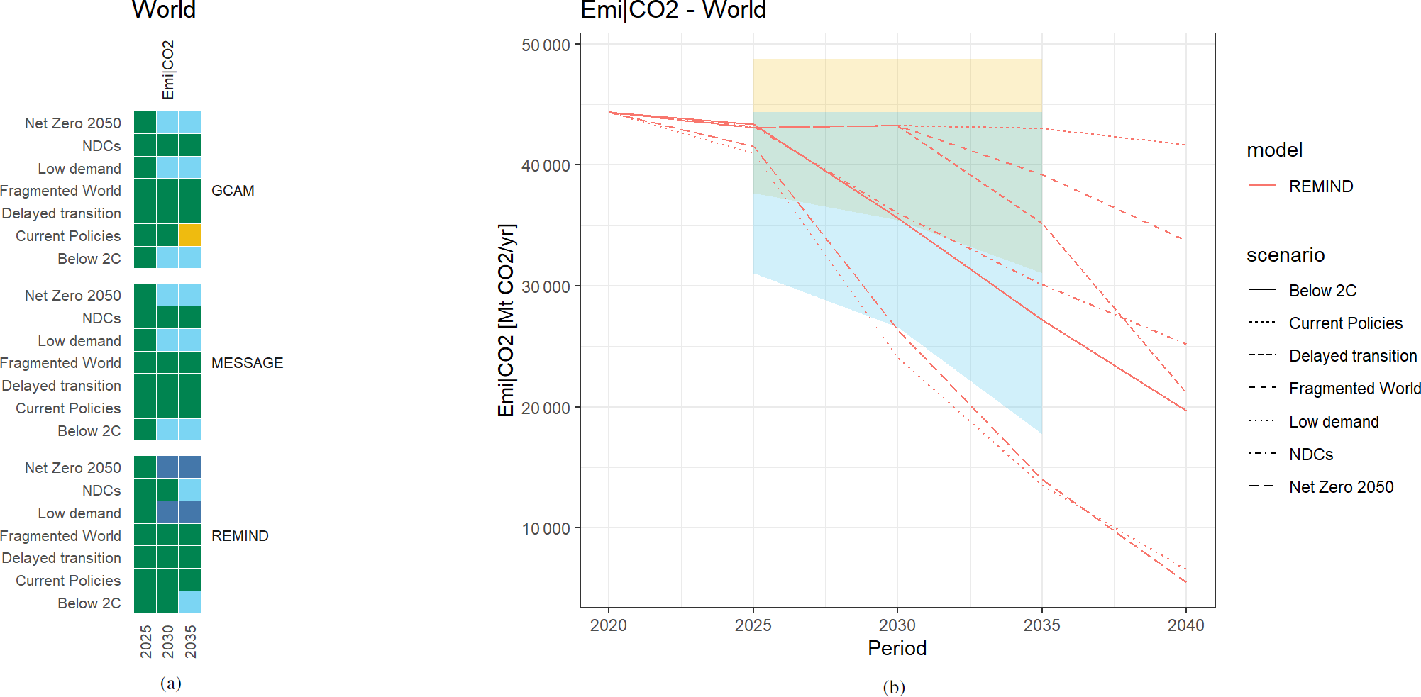 Figure 8Period intercomparison example demonstrating a feasibility study on how fast global emissions can be reduced compared to 2020, using (a) a heat map for all models and (b) a line plot for REMIND.