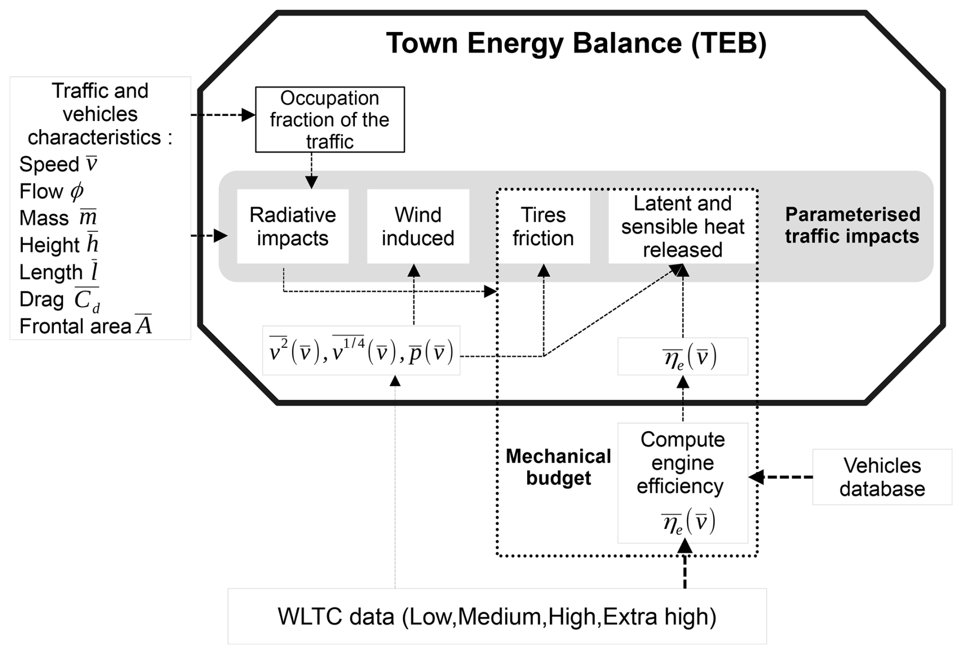 The vehicle dynamics and internal energy balance are modelled through a system of 4 simple equations. The vehicle trajectory is assumed to be a rectilinear motion on a road assumed to be flat. Following the simple tools developed to model the response of a vehicle, the traction force imposed by the engine on the wheels Ftrac in newton is calculated from an equilibrium equation applied to the vehicle following the kinematics of point masses. As the other terms of the motion equation can be estimated, this allows to deduce the force, and corresponding power Ptrac. A fraction of the oil consumed by the internal combustion engine of vehicles that deliver the power Pfuel in watts is transformed into mechanical power with traction power Ptrac in watt through the total instantaneous vehicle efficiency coefficient η. The power lost due to the vehicle mechanical and thermodynamical inefficiencies is then dissipated as heat Pheat loss in watts. This system is written: