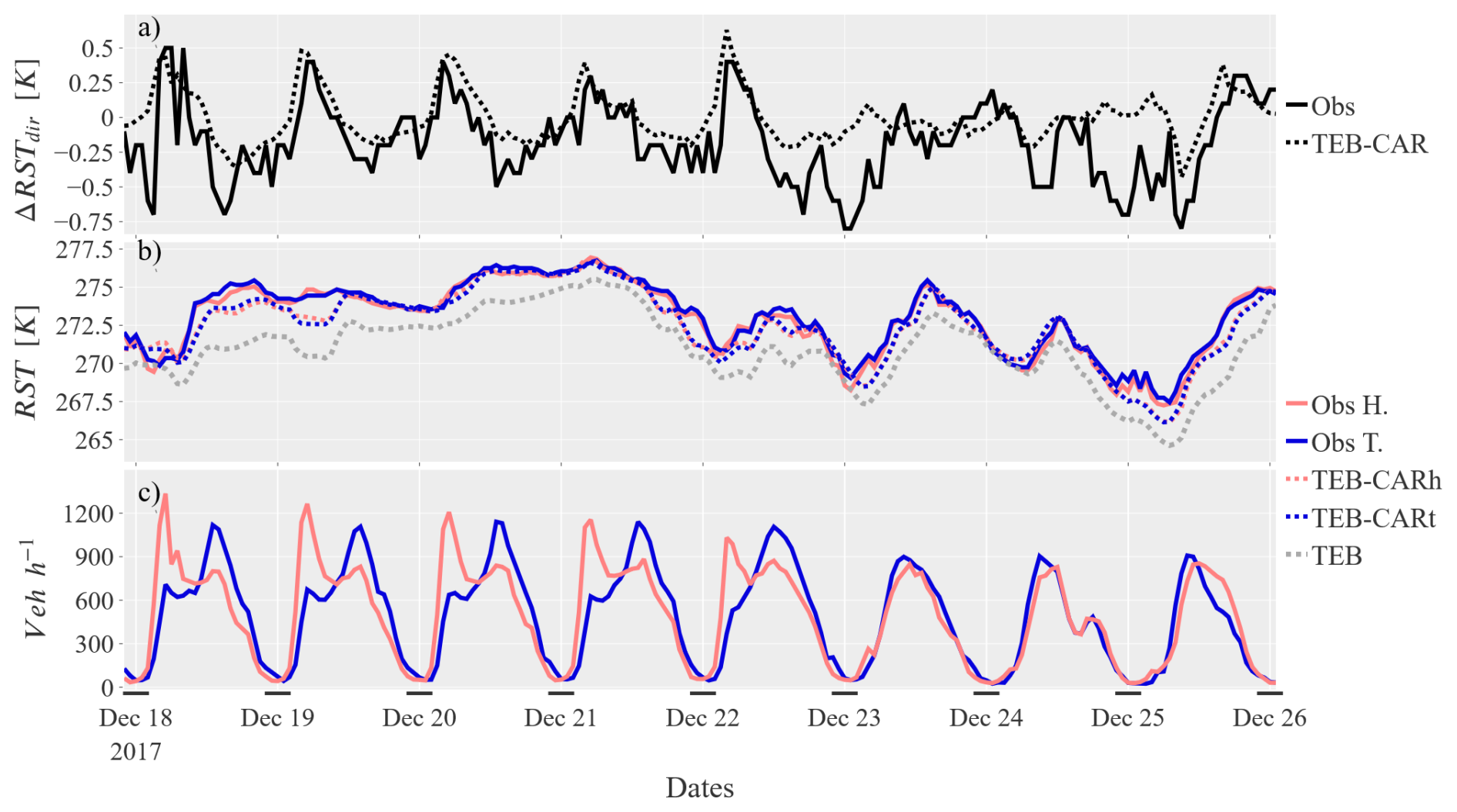 One should confirm that the bias reduction is not coincidental with other potential biases such as sensor bias. So, the temperature difference caused by the commuting pattern between the two lanes is used to verify the accuracy of the traffic-induced effects modelled in TEB-CAR. In Fig. 5, the TEB-CAR RST differences (ΔRSTdir) match the observed ΔRSTdir amplitude. The strongest ΔRSTdir during peak traffic, especially in the morning, are well reproduced by TEB-CAR. The traffic intensity differences are lower in the afternoon than in the morning, leading to a lower observed ΔRSTdir. These amplitudes are well reproduced by TEB-CAR.