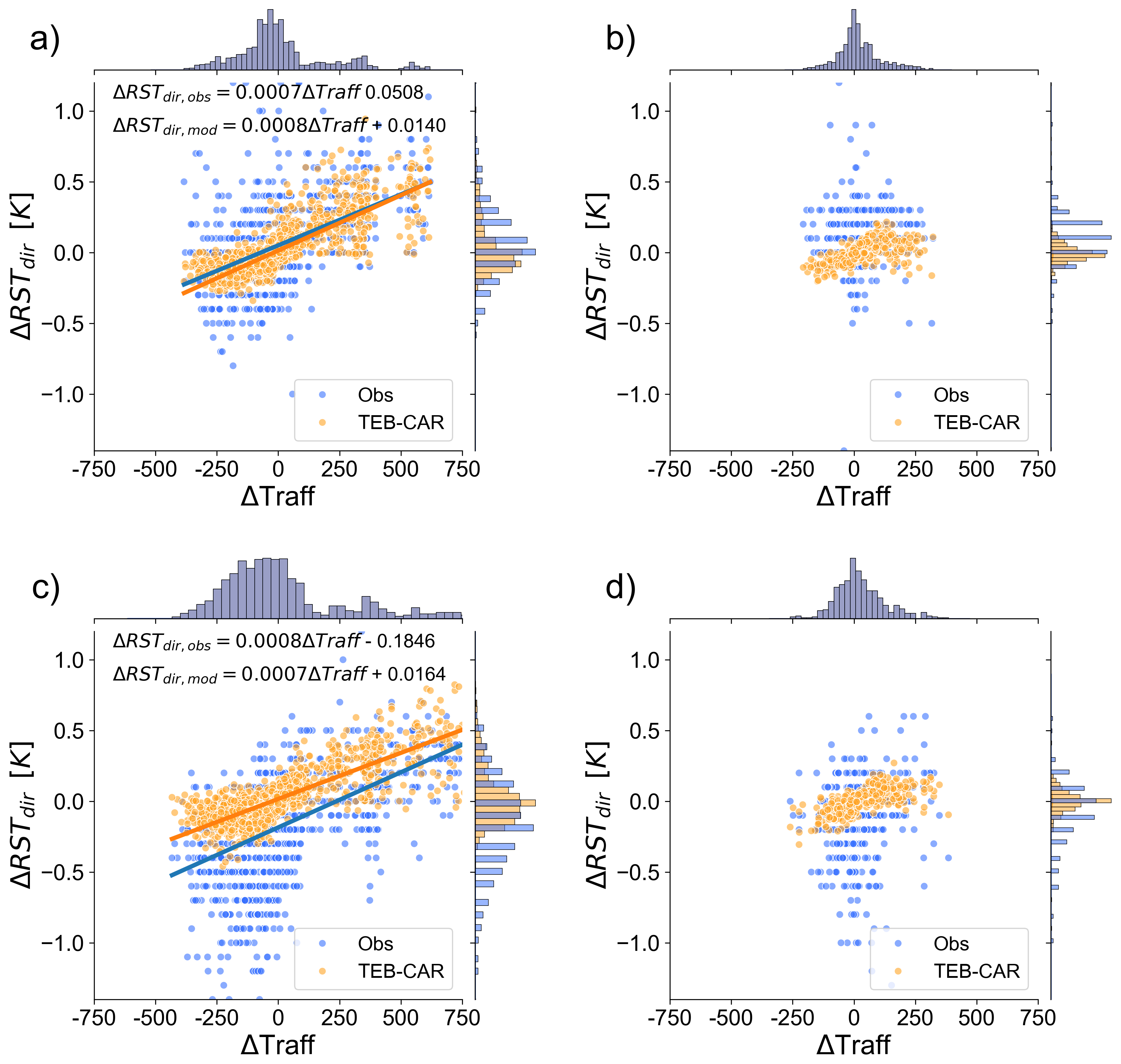 Consistency is found between the simulated and observed traffic-induced effects with almost equivalent slopes between the observed and simulated ΔRSTdir from the robust linear regressions (RLM) (Huber, 1973), designed to be robust to outliers. Also, regression equations for both at Nupuri and Palojärvi location have the same slope depending on whether it is calculated on observations or simulations. So, there is a consistent behaviour of the traffic impact on TEB subject to different traffic patterns and atmospheric conditions. The TEB-CAR simulations accurately represent the traffic differences impact up to 750 vehicles per hour. At Nupuri location, the observed and simulated ΔRSTdir distributions are shifted, the intercept of the regression equation for observed ΔRSTdir is negative, and the observed ΔRSTdir have a negative intercept. These features suggest that there is elements that produce this cold bias at Nupuri location that are not taken into account into TEB-CAR. It can also suggests that there is a sensor bias at this location since this effect is not found at Palojärvi location.