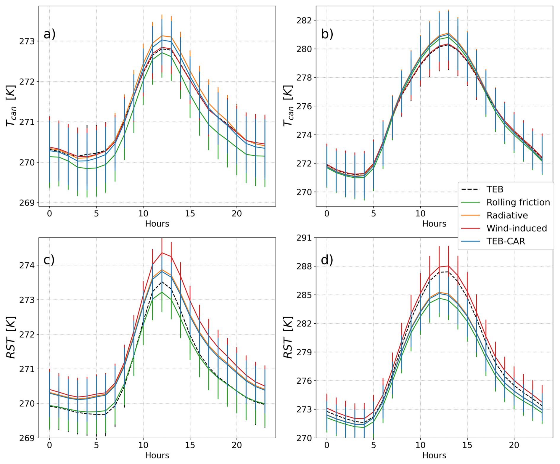 Figure 7On the Turku road direction, TEB, TEB-CAR and ablation experiment simulations with one traffic impact removed for each simulation. Simulated low air temperature Tcan (K) on panels (a) and (b) and road surface temperature RST (K) at panel (a) and (b) with the confidence interval of the estimator of the expected value. (a) and (c) are calculated on the winter period and (b) and (d) on the spring period