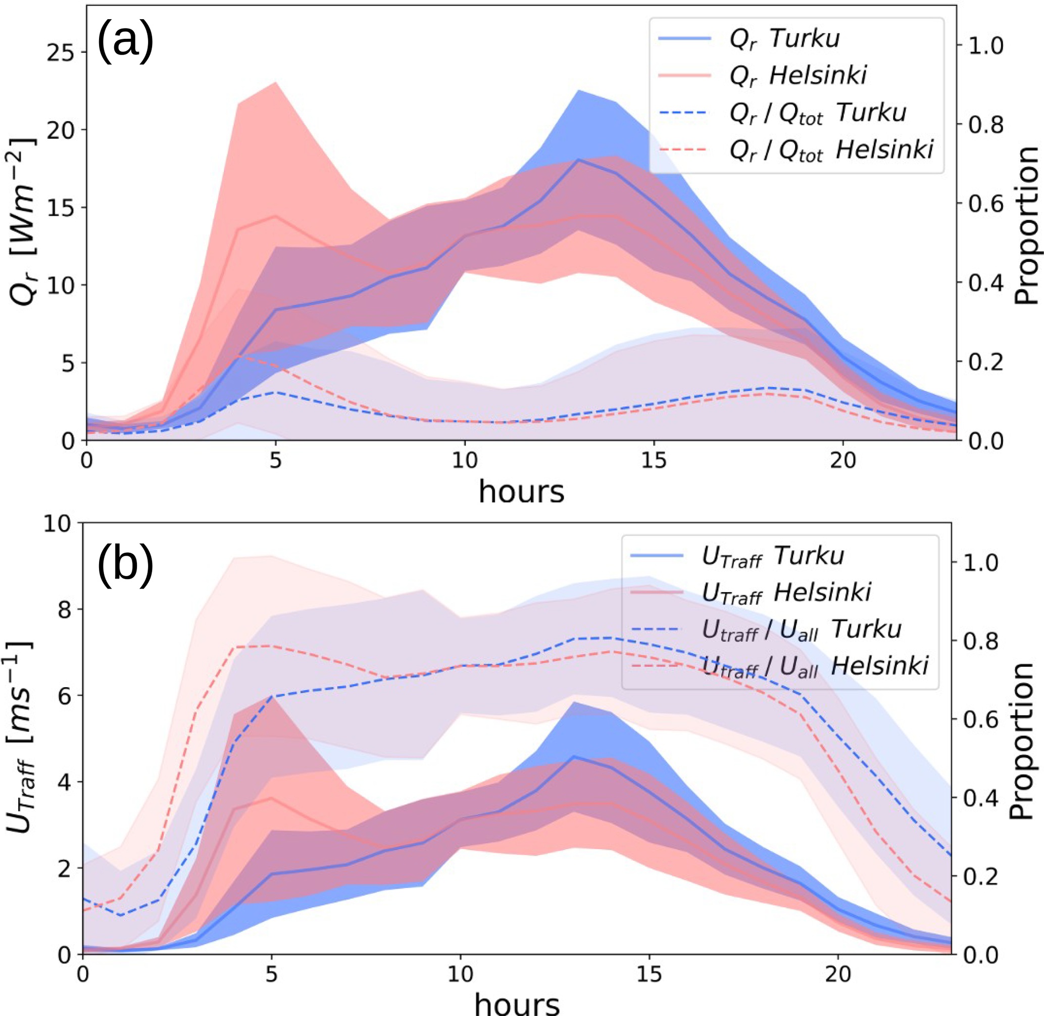 Figure 9Diurnal traffic-induced effects in the TEB-CAR model on the whole simulation period for the Nupuri experiment and for both road directions, with the proportion of the total impact. (a) Rolling friction and its marginal amplitude on the total net heat at the road surface Qtot (b) Wind-induced and its marginal amplitude on the total wind on the lower layer of the atmosphere Uall at 0.5 m.