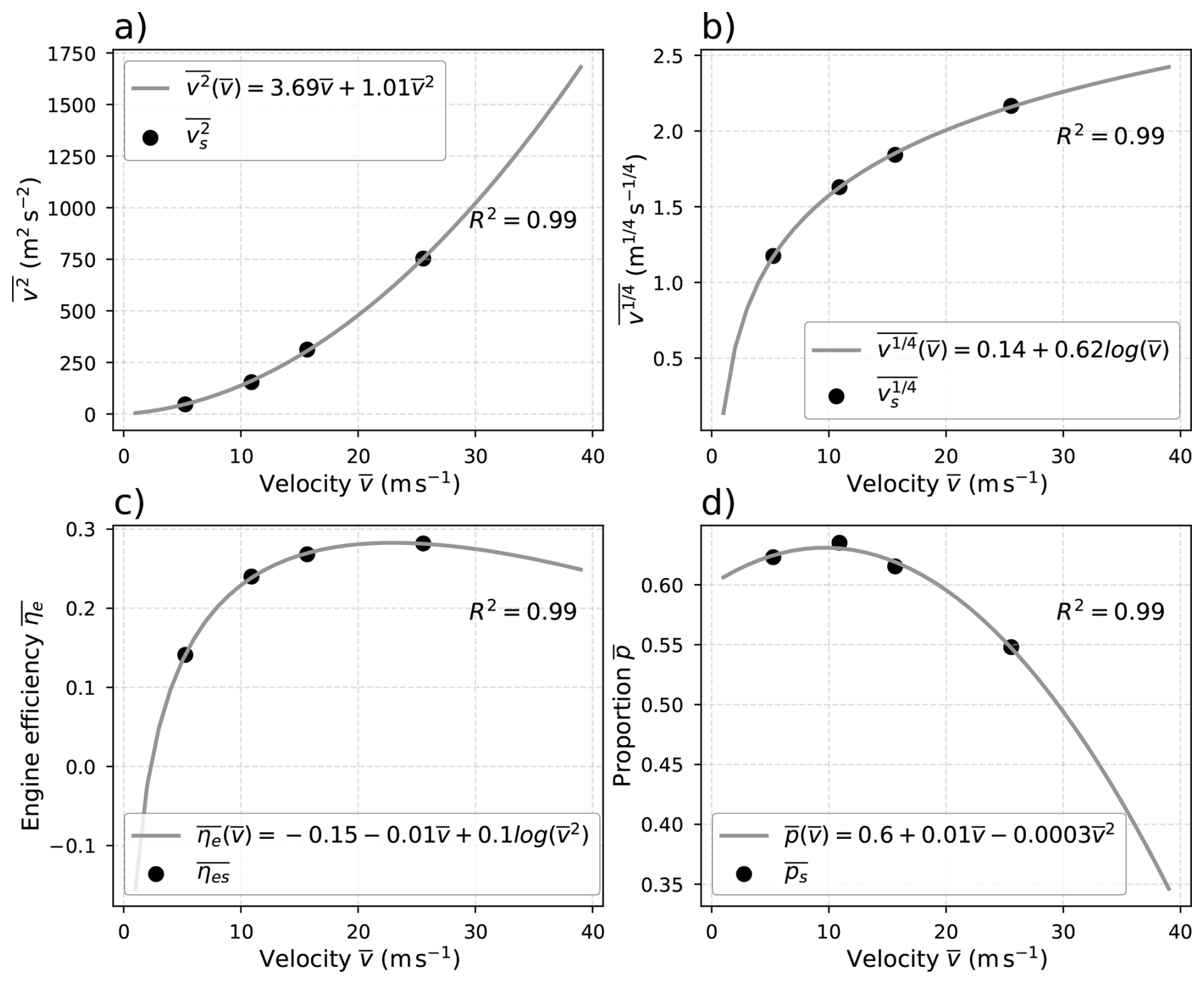 These terms are then extended for any given average speed . Regression equations are learnt to estimate the behaviour of the automobile fleet given the average speed . Simple multiple linear regressions (MLRs) are performed and give the estimates ), ), ) and ) drawn in Fig. B1. The positive acceleration is averaged as a single value = 0.28 since no simple relationship with the average speed can be found. To keep the consistency with the dynamic of a real vehicle, two thresholds are added to these estimates at really low speed and high speed. The following conditions are satisfied: