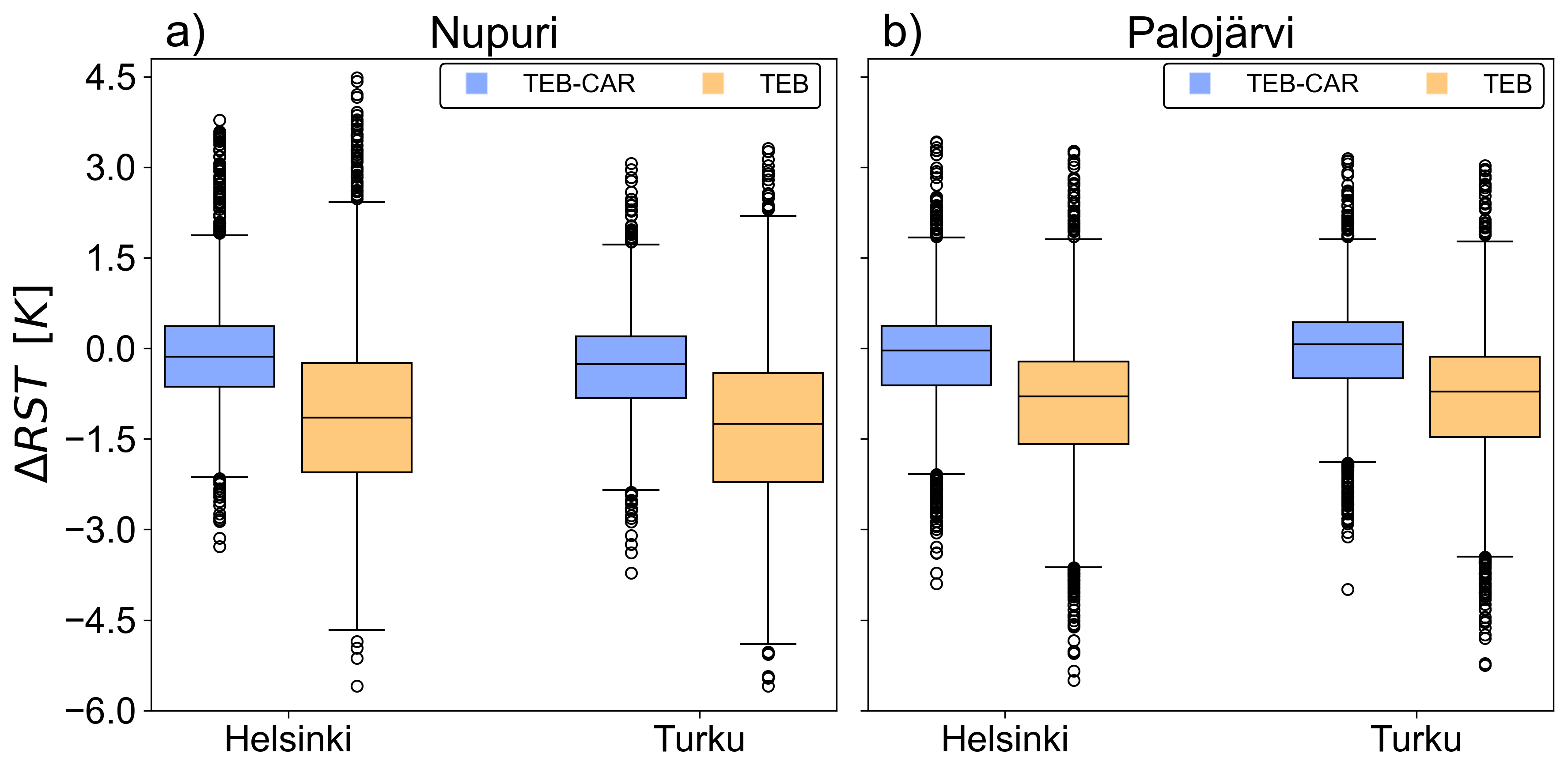 Figure C1Boxplot of TEB and TEB-CAR simulations differences with the road surface temperature observations at Nupuri and Palojärvi location for the two directions, Helsinki and Tuku on joint Nupuri and Palojärvi period. The boxes extend from the first quartile (Q1) to the third quartile (Q3), with whiskers up to the farthest point lying within 1.5× the interquartile range (Q3−Q1).