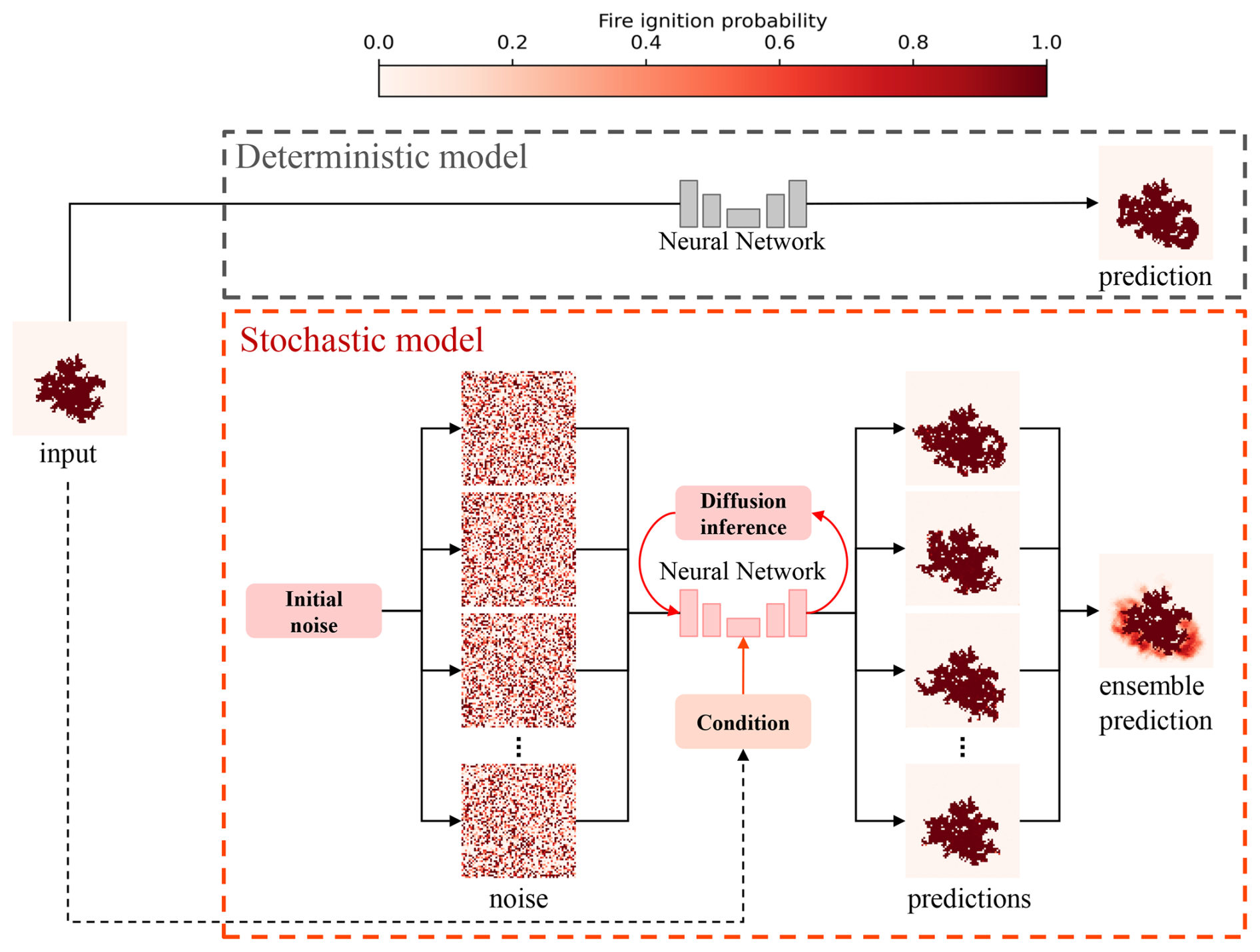 Despite these advancements, current ML approaches to wildfire spread prediction predominantly rely on deterministic models. This reliance significantly limits their capacity to account for the stochastic nature of wildfire dynamics, which are profoundly influenced by complex and variable factors such as wind speed, canopy density, and topographical variations. Such models struggle to reflect the inherent uncertainty and variability of natural systems, which is particularly problematic for phenomena like wildfire spread, where minor changes in environmental conditions can result in vastly different outcomes (Holsinger et al.2016; Dahan et al.2024). As a result, deterministic ML techniques fail to capture this stochastic behaviour of wildfire propagation.