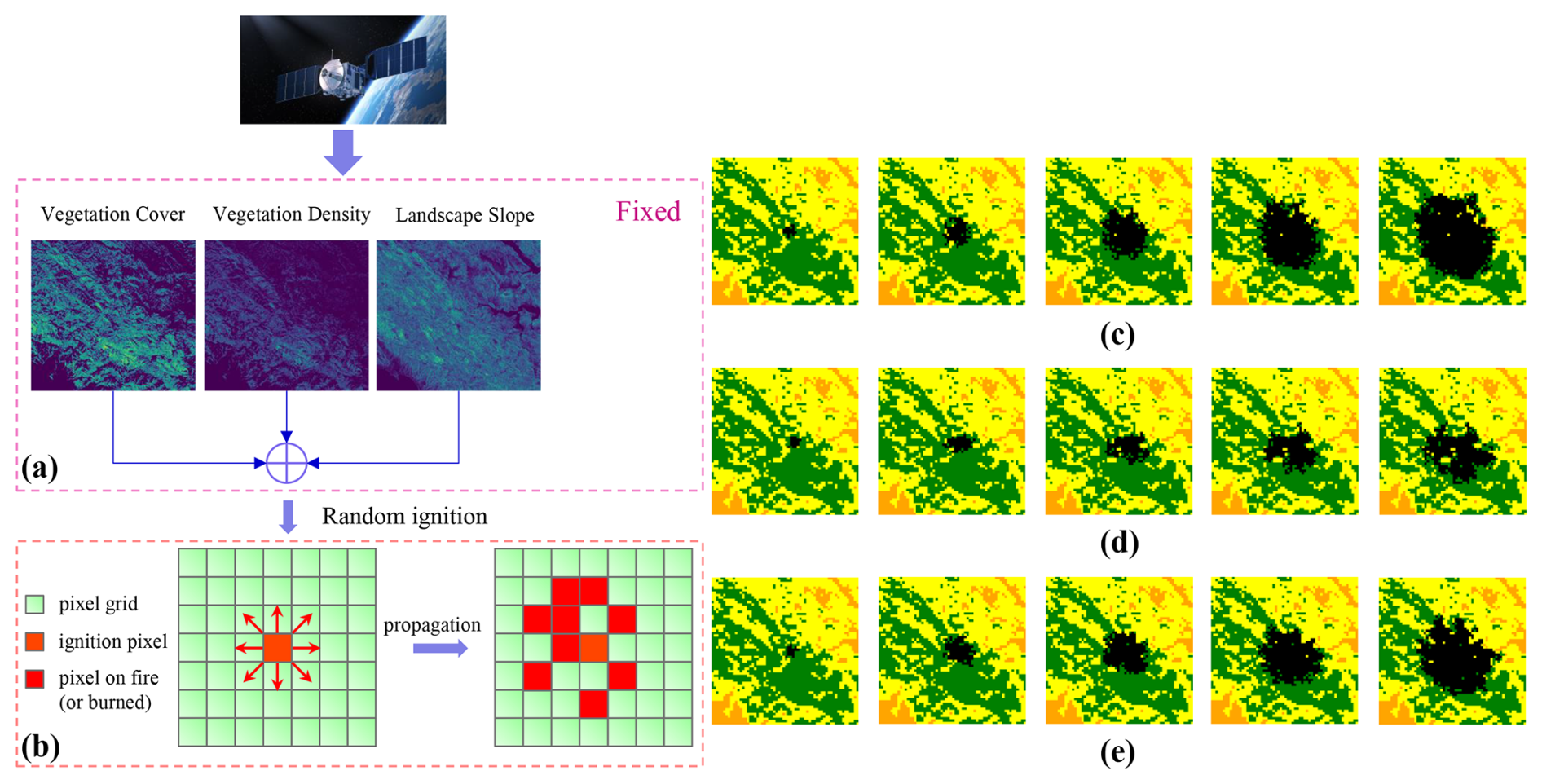 Climate change has amplified extreme weather events, driving an increase in the frequency and scale of wildfires worldwide. These fires have devastating impacts on infrastructure, human safety, ecosystems, and the environment (Gajendiran et al.2024). Each year, millions of hectares of forest are destroyed, resulting in the loss of wildlife habitats and plant communities, heightened greenhouse gas emissions, and severe economic and human casualties (Sun et al.2024; Pelletier et al.2023). To address these challenges, physics-driven probabilistic models such as cellular automata (Freire and DaCamara2019) and Minimum Travel Time (Finney2002) have been developed to simulate the spread of wildfires under real geographic conditions. Despite their ability to model fire dissemination patterns, these approaches face significant limitations in speed and computational efficiency due to their dependence on extensive geophysical and climate data. Furthermore, physical models often lack robustness to environmental variations due to limited explanations of combustion mechanisms (Jiang et al.2023) and demand substantial computational resources to solve complex conservation equations and require specialised expertise, making them challenging to design and implement (Makhaba and Winberg2022; Jiang et al.2023).