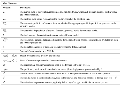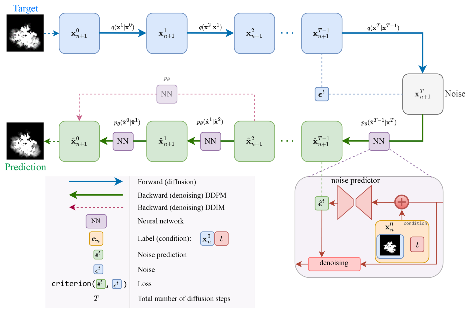 To train a diffusion model capable of predicting the wildfire state at a future time point, a supervised learning strategy is employed. Consistent with the framework introduced by Ho et al. (2020), the forward process is defined by a sequence of latent variables xn+1t, where noise is gradually added to the clean wildfire state xn+10 across timesteps. At each pseudo-timestep t, the noisy version xn+1t is constructed as