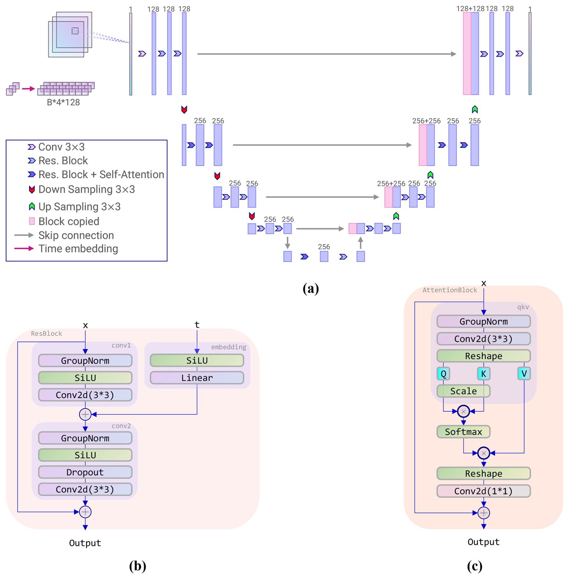 where 𝒩(⋅) denotes a Gaussian distribution with βt as the variance of the noise added at step t, and I as the identity matrix, indicating isotropic noise. The values of βt are set according to a linear schedule increasing from a small initial value to a maximum value at T, following the approach in Ho et al. (2020), ensuring a gradual and controlled diffusion process. As t progresses from 1 to T, the state xt becomes increasingly noisy.