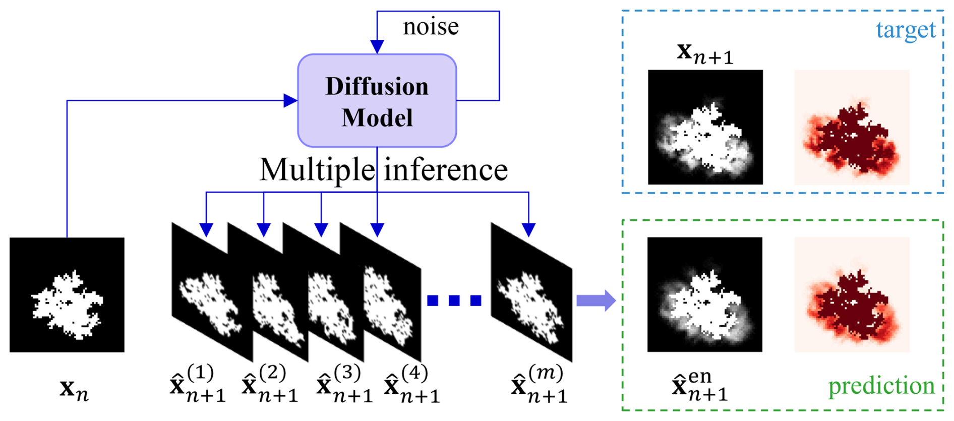 Since the reconstruction is driven by the initial noise and intermediate draws from the transition probability, the diffusion model can produce different predictions from the same initial conditions. By sampling m-times different noise samples, the diffusion model generates effectively an ensemble of predictions, denoted as set (x^n+10,(1),x^n+10,(2),,x^n+10,(m)). Based on this ensemble, we can evaluate the probability that a cell is burned.