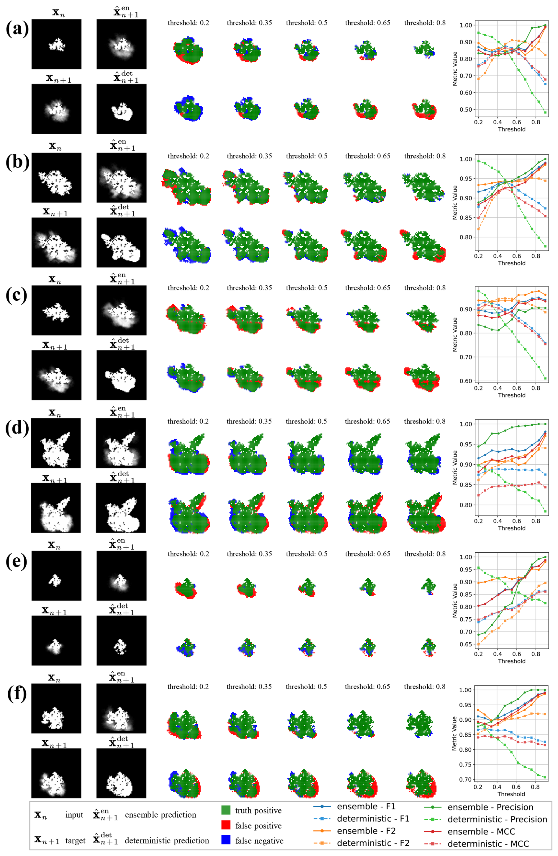 An ensemble testing dataset was constructed specifically for evaluation purposes to assess whether the generative predictive model accurately represents the probability density distribution of wildfire spread. As depicted in Fig. 3d, each sample in the ensemble dataset consists of a sequence of frame pairs, where each pair comprises a wildfire state at a given time step and the corresponding ensemble-predicted next state.