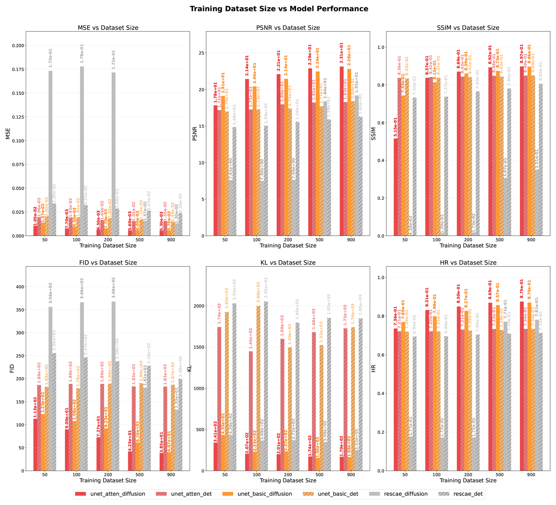 The results in Fig. D1 demonstrate that the UNet Architecture with attention mechanisms generally outperforms the UNet Basic Architecture without attention blocks, though the improvement varies across metrics and dataset sizes. For instance, at training dataset size 500, the attention-enhanced UNet achieves superior performance in MSE (5.60×10-3 vs. 6.00×10-2), SSIM (8.92×10-1 vs. 8.73×10-1), and FID (4.23×101 vs. 6.16×101) whilst showing comparable performance in other metrics such as PSNR. However, at smaller dataset sizes like 100, the performance differences become less pronounced, with some metrics showing marginal improvements whilst others exhibit comparable or slightly inferior performance. This modest enhancement can be attributed to the relatively simple nature of the experimental data and its low resolution, which may not fully exploit the capabilities of attention mechanisms. In contrast, the comparison between UNet architectures and the Residual AutoEncoder Architecture reveals more substantial performance differences. The UNet structures consistently demonstrate significant improvements across multiple metrics, highlighting the importance of skip connections in preserving fine-grained information throughout the encoding-decoding process.