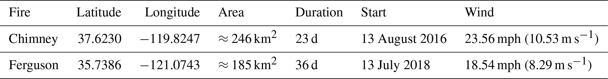 Table 1Information of the study areas used in this research, including details on fire incidents, their geographic coordinates, affected area, duration, start date, and average wind speed.