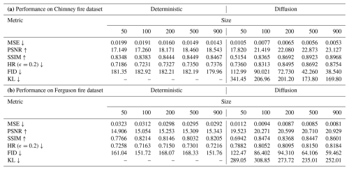 This ablation experiment evaluates three distinct neural network architectures across varying training dataset sizes {50, 100, 200, 500, and 900 samples}, comparing stochastic diffusion models against deterministic supervised learning approaches. The architectures examined include: (1) UNet Architecture used in this study (unet_atten), which incorporates attention mechanisms for enhanced feature representation; (2) UNet Basic Architecture (unet_basic), which represents a simplified variant without attention blocks; and (3) Residual AutoEncoder Architecture (rescae), which maintains a similar network structure to the UNet but removes skip connections. All models were trained using identical hyperparameter configurations, including a learning rate of 1×10-5 (selected from candidates 1×10-3,1×10-4,1×10-5 as the optimal choice), 200 training epochs, and the AdamW optimiser with weight decay of 1×-4. All models are evaluated on the ensemble test dataset of the Chimney fire event.