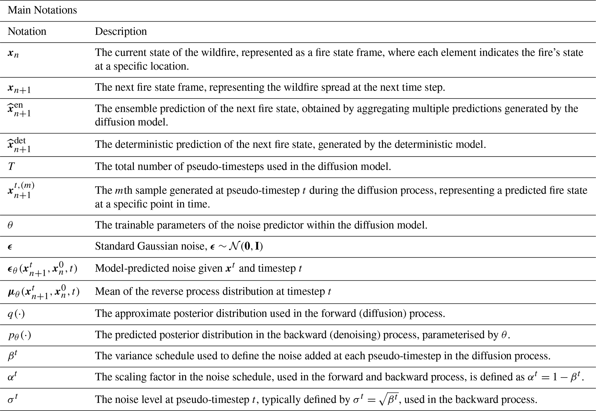 During training, the noise predictor ϵθ(xn+1t,xn0,t) is optimised to estimate the noise ϵ that was introduced to the data frame at each pseudo-timestep t. The parameter set θ represents the trainable weights of the neural network, which serves as the noise predictor within the diffusion model. The objective of training is to minimise the discrepancy between the true noise ϵ, sampled from a standard Gaussian distribution 𝒩(0,I), and the predicted noise ϵθ(xn+1t,xn0,t), which is the model's estimate of the noise present at pseudo-timestep t. By minimising this discrepancy, the model learns to progressively refine noisy representations xn+1t and reconstruct the original wildfire state xn+10.