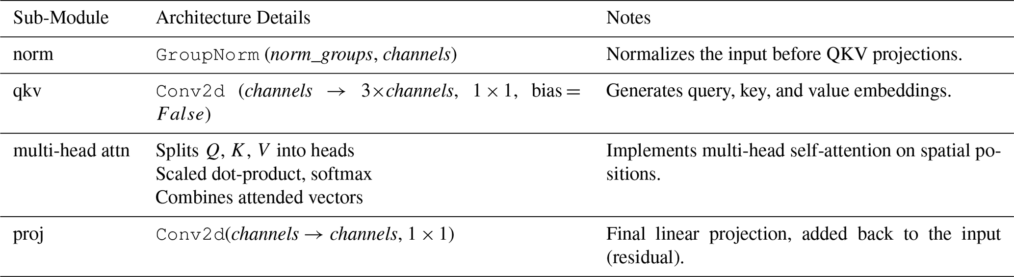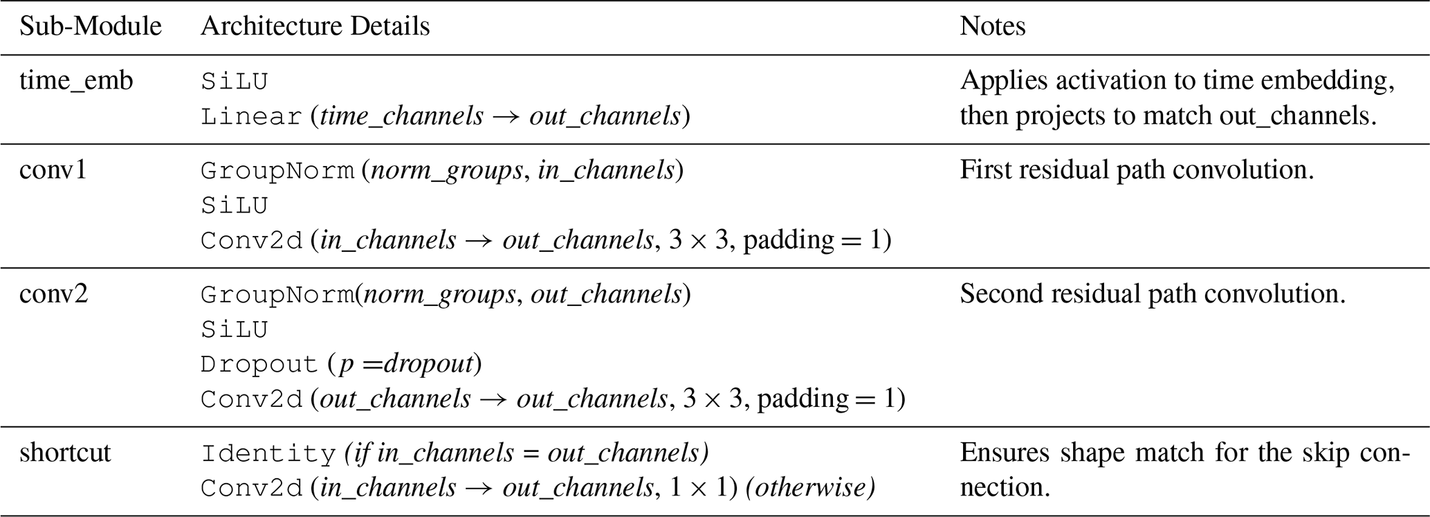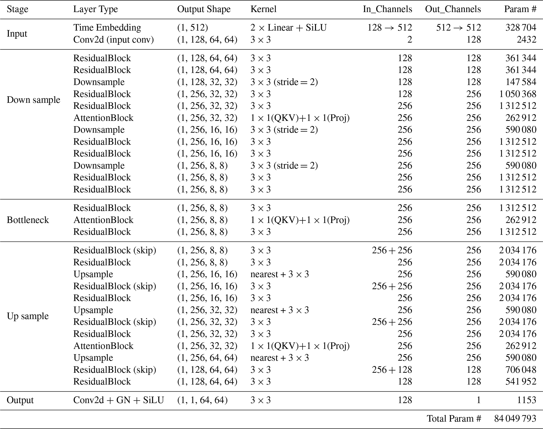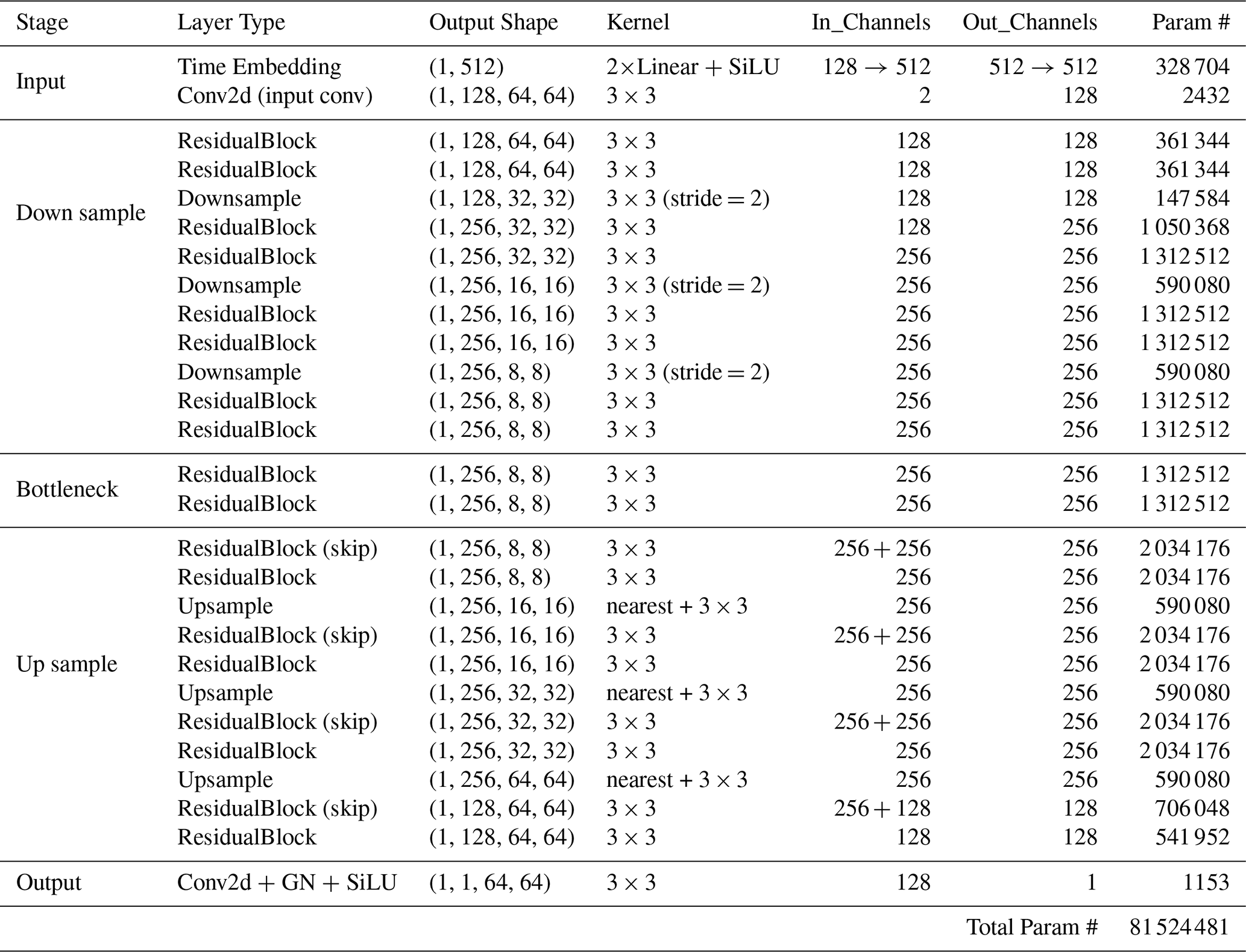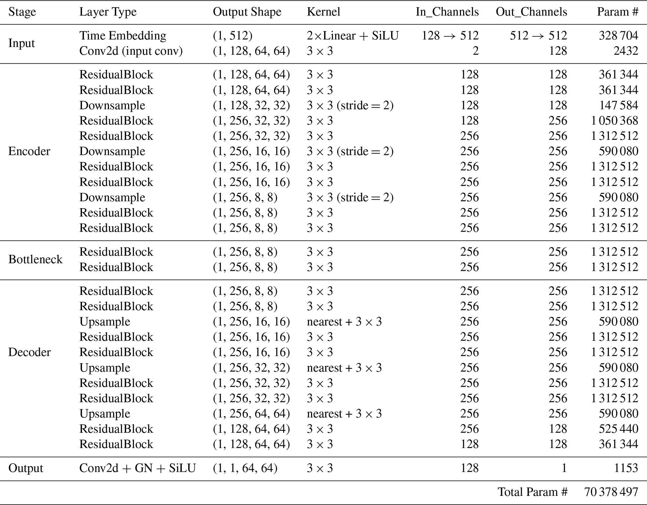 where αt and α¯t are scalar coefficients derived from a predefined forward noise schedule following (Ho et al.2020), with αt=1-βt and α¯t=s=1tαs. The variance (σt)2 determines the stochasticity in the reverse process and is typically set to match the forward noise scale, i.e., (σt)2=βt. In summary, ϵθ denotes the output of a neural network trained to predict the noise added during the forward process, while μθ is a deterministic function derived from ϵθ that defines the mean of the denoising Gaussian distribution used during inference. This parameterisation allows efficient training through a simple regression objective and enables high-quality sample generation during the reverse diffusion process.