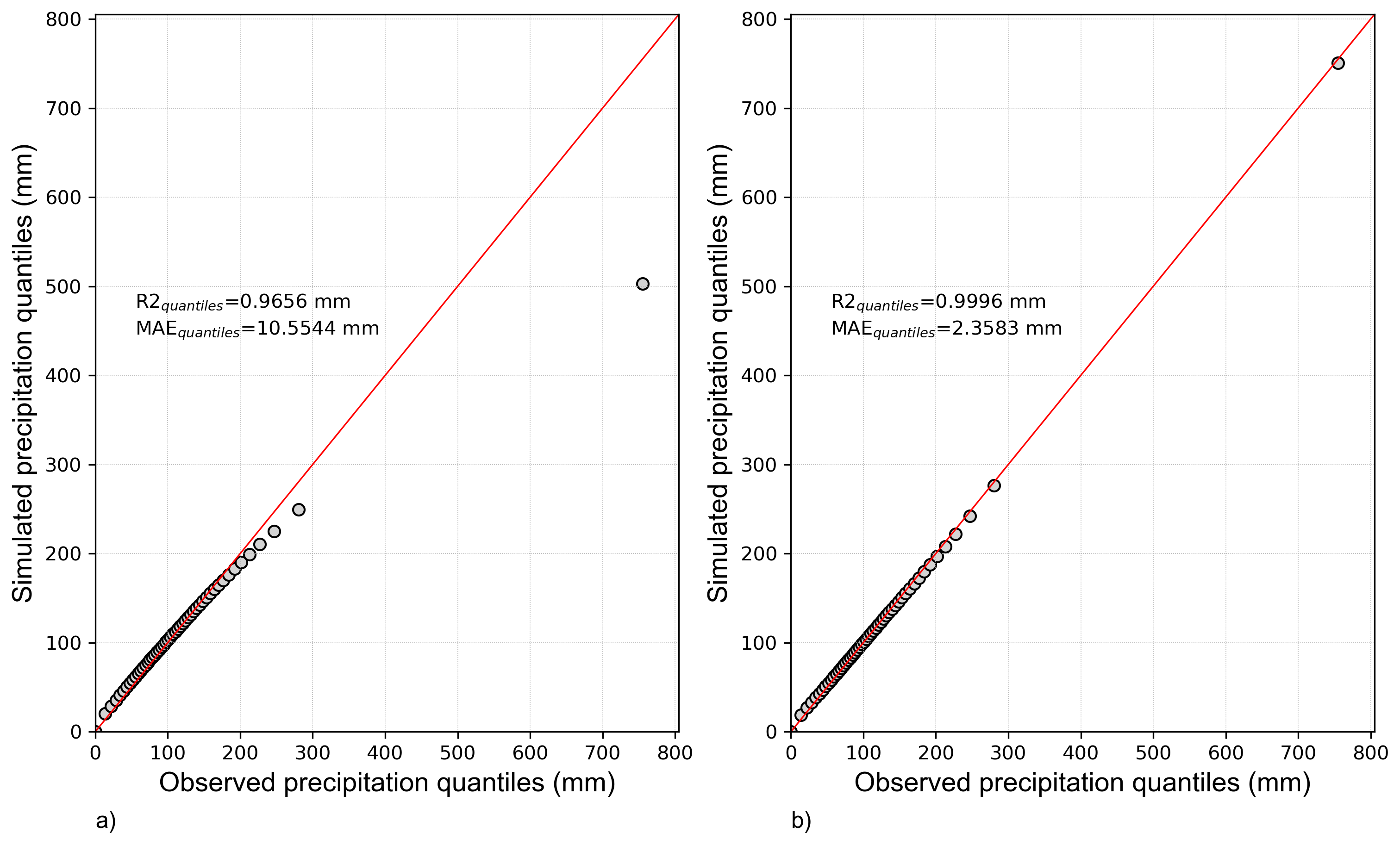 Figure A6Comparison of summer (JJA) observed precipitation quantiles and (a) REFinterpolated (b) downscaled with GeoDS precipitation quantiles using a 10 km input DEM.