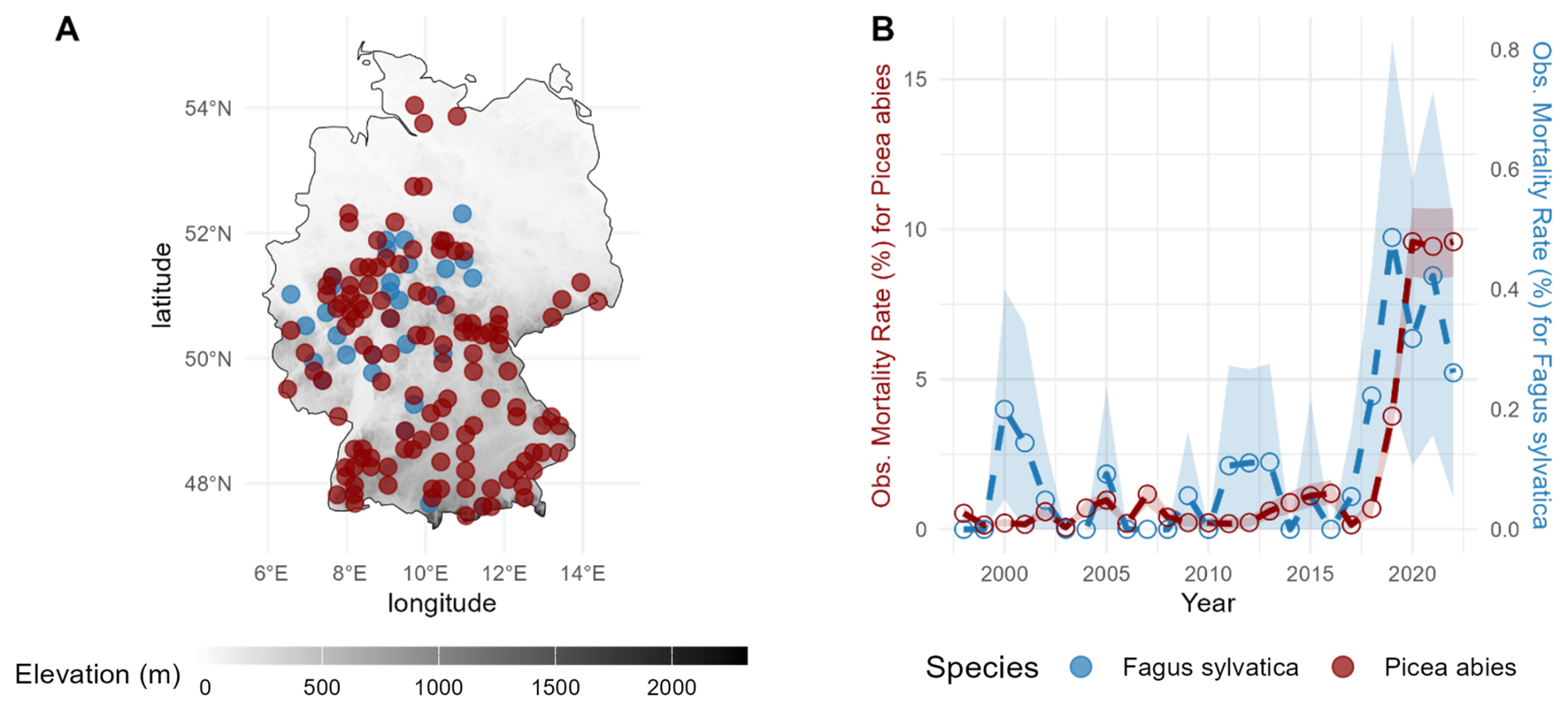 Figure 1Location of the ICP Forest Level I plots for the present study (a) and the respective observed annual mortality rates (b) for European beech (blue) and Norway spruce (dark red) averaged across sites from Knapp et al. (2024). The shaded blue and red areas represent ±1 standard deviation derived via a bootstrap procedure to show the variability in the observed data.